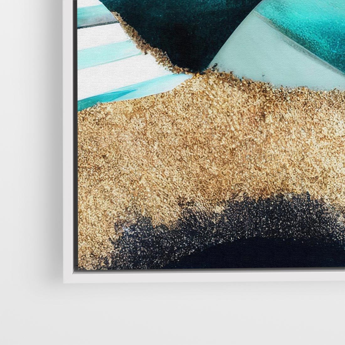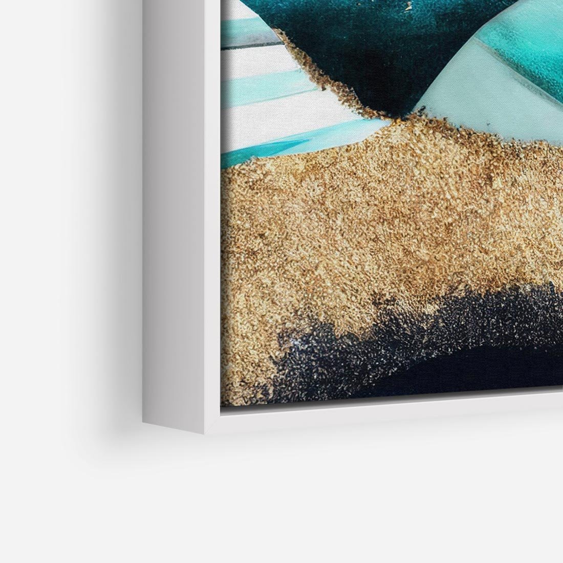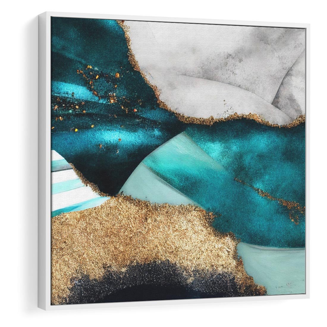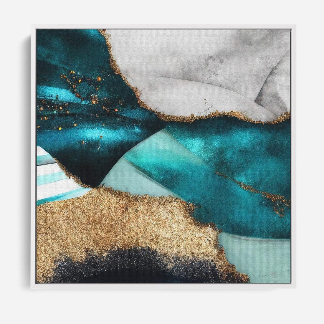 Obraz w ramie 50x50 - Rozlane Turkusy - Turkusowe plamy, złote elementy - rama biała