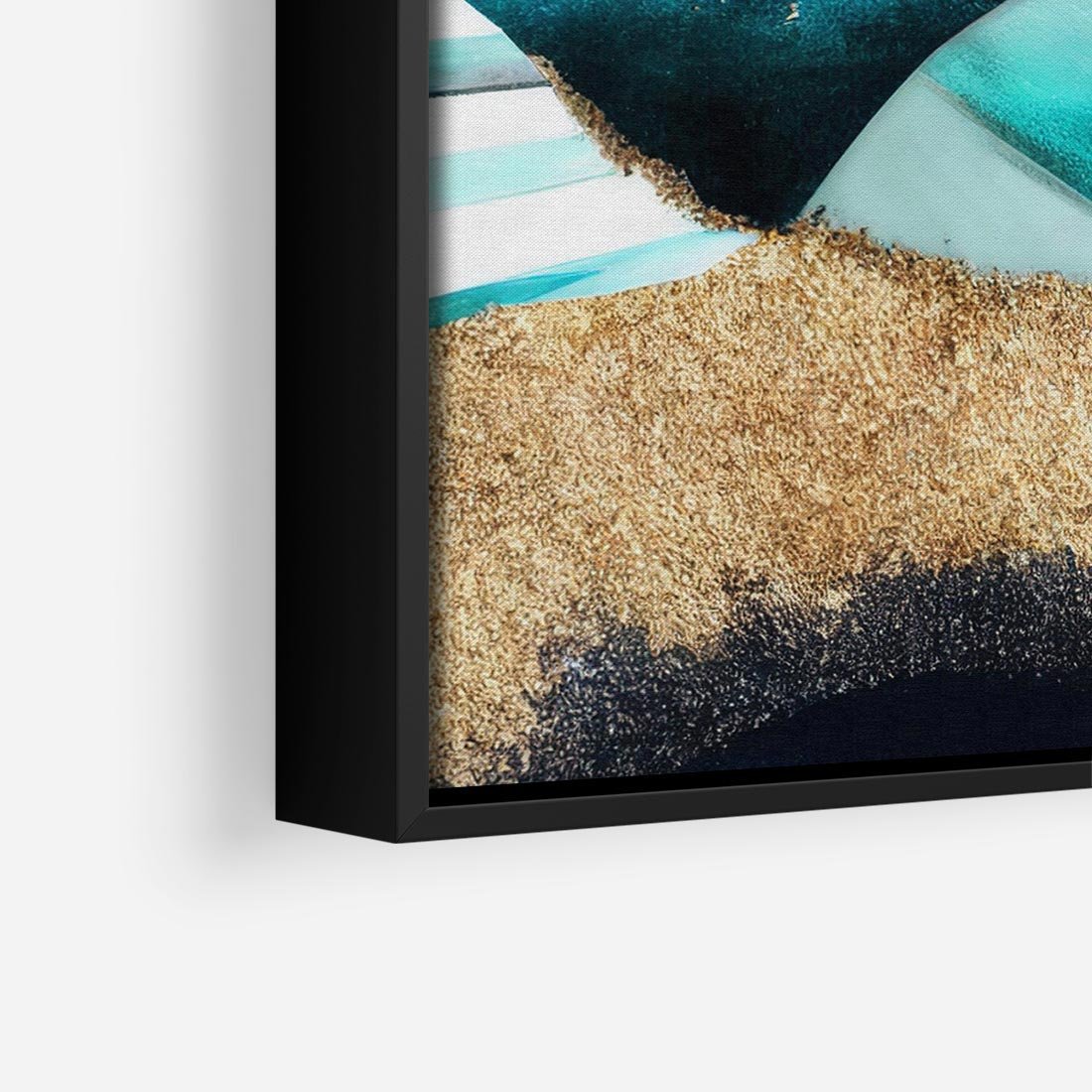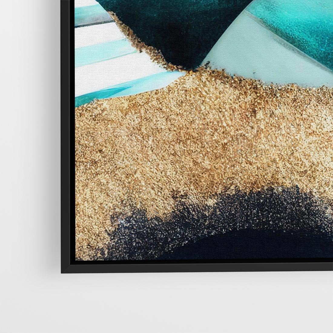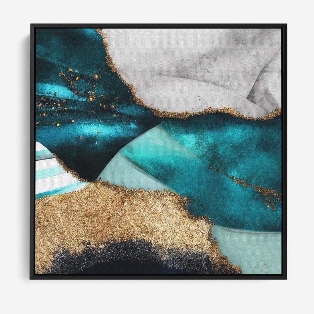 Obraz w ramie 50x50 - Rozlane Turkusy - Turkusowe plamy, złote elementy - rama czarna
