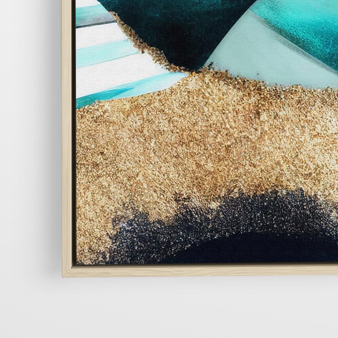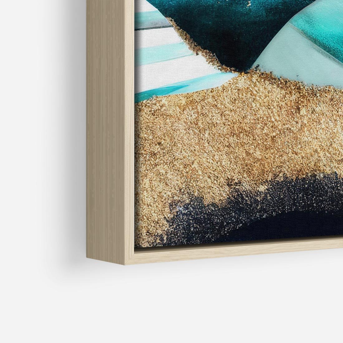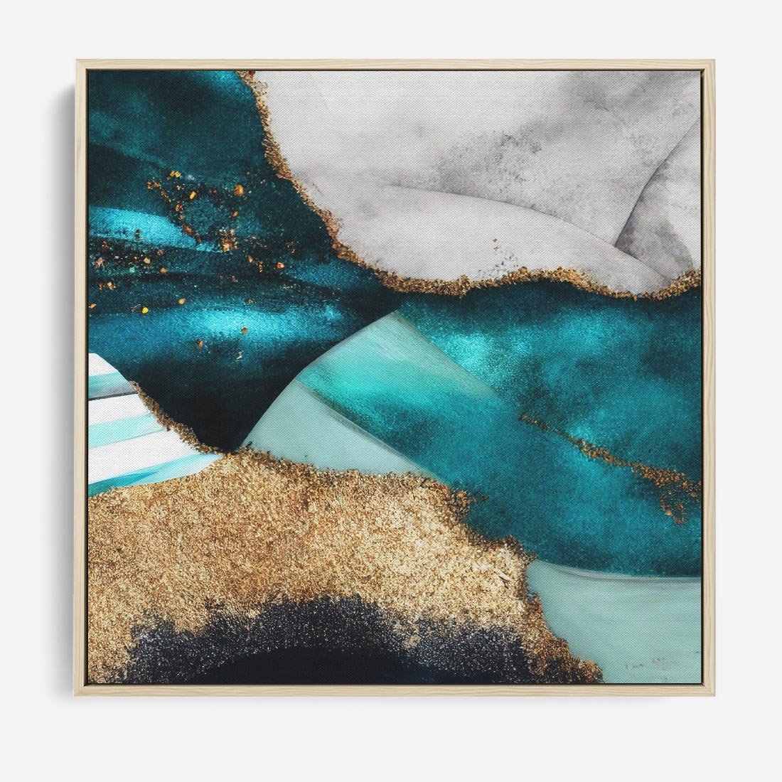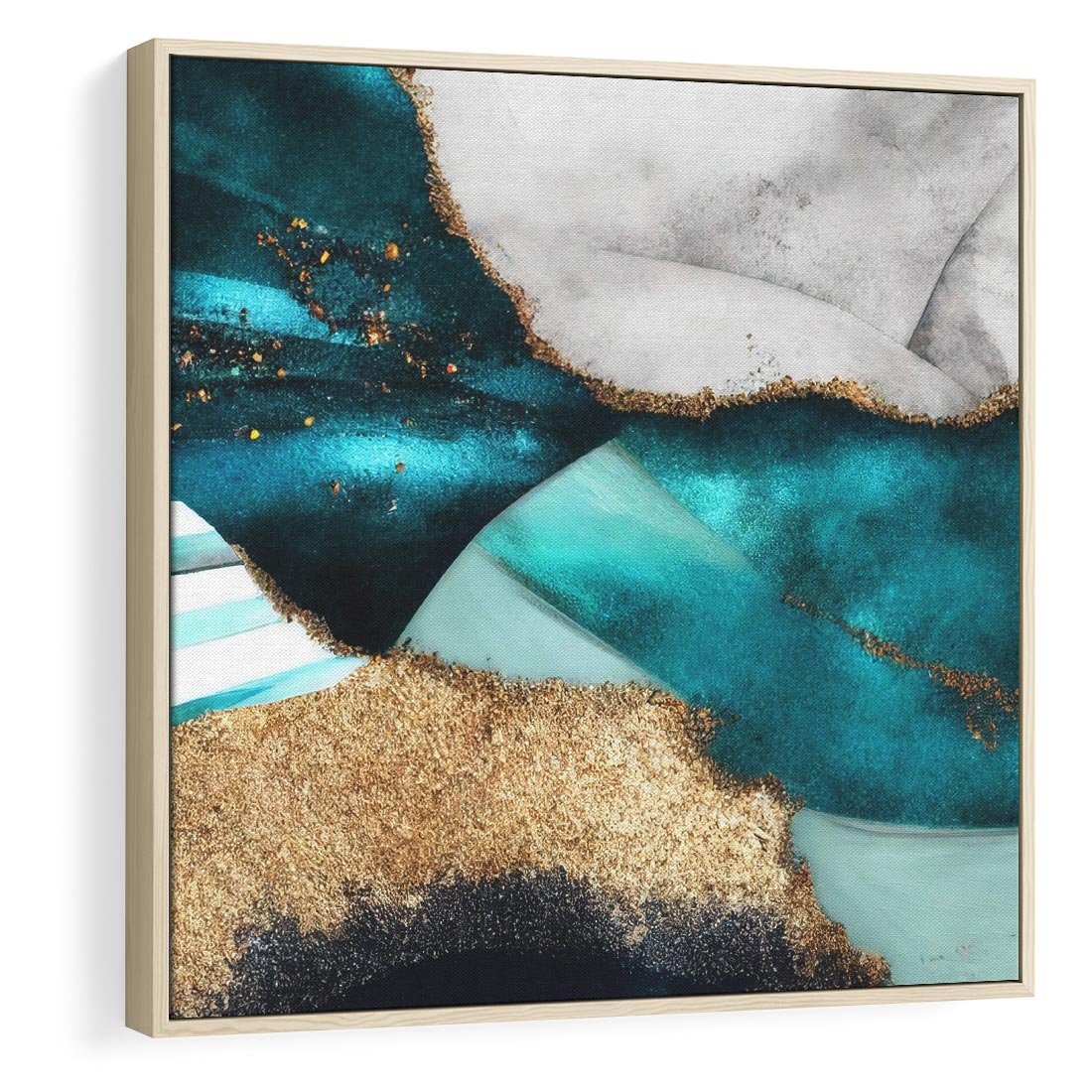 Obraz w ramie 50x50 - Rozlane Turkusy - Turkusowe plamy, złote elementy - rama drewno