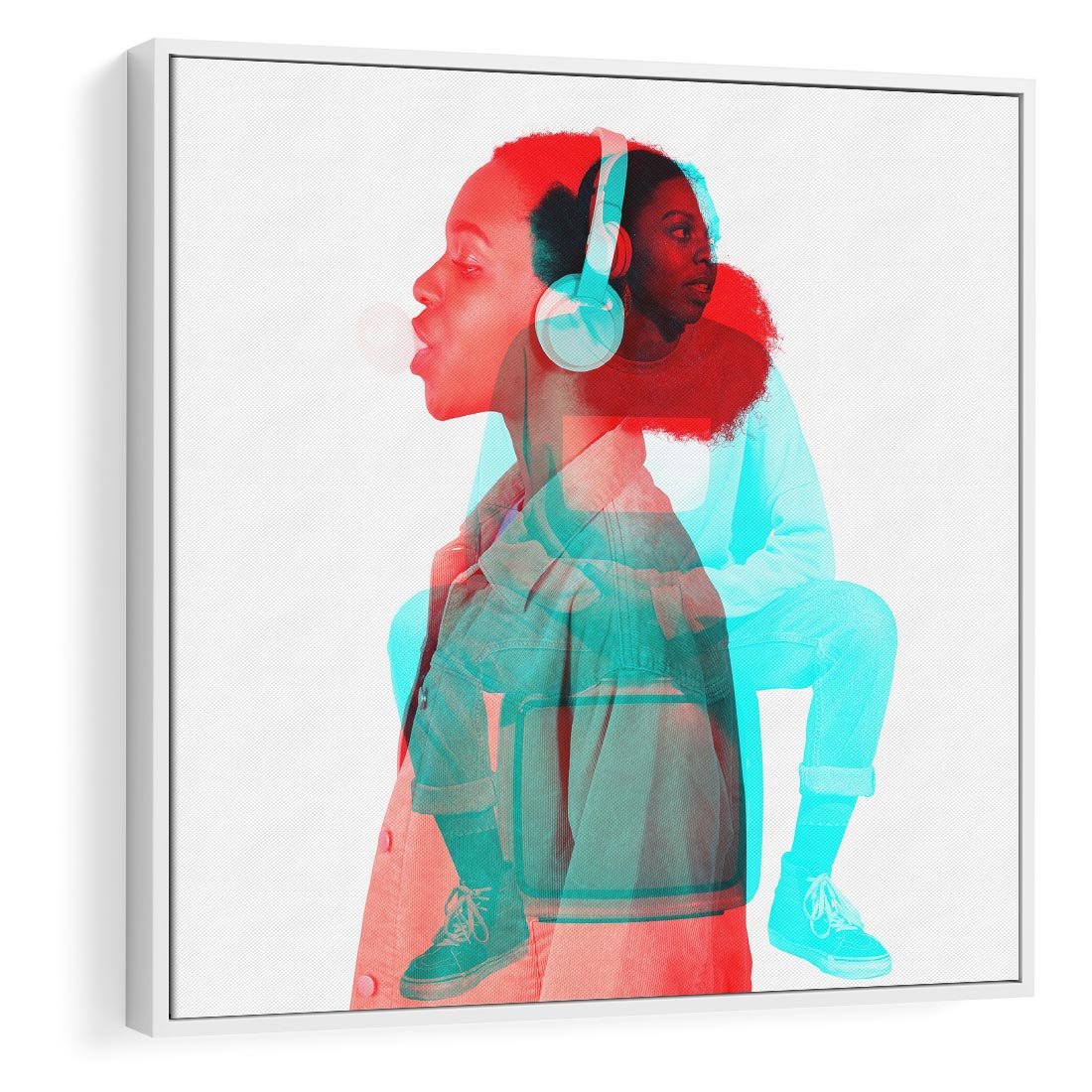 Abstrakcyjny kolaż przedstawiający kobietę w słuchawkach ukazuje fascynujący świat dźwięków i muzyki. To dzieło sztuki oddaje hołd stylowi retro, łącząc barwne zdjęcia w unikalną kompozycję, która ożywa wspomnienia i tworzy nowe emocje.