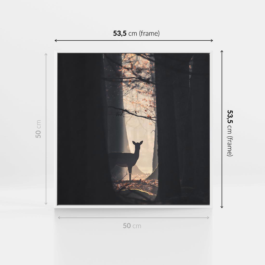 Obraz w ramie 50x50 - Sarnie Skoki - zdjęcie, klimatyczny las - rama biała