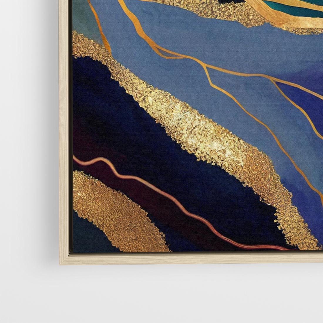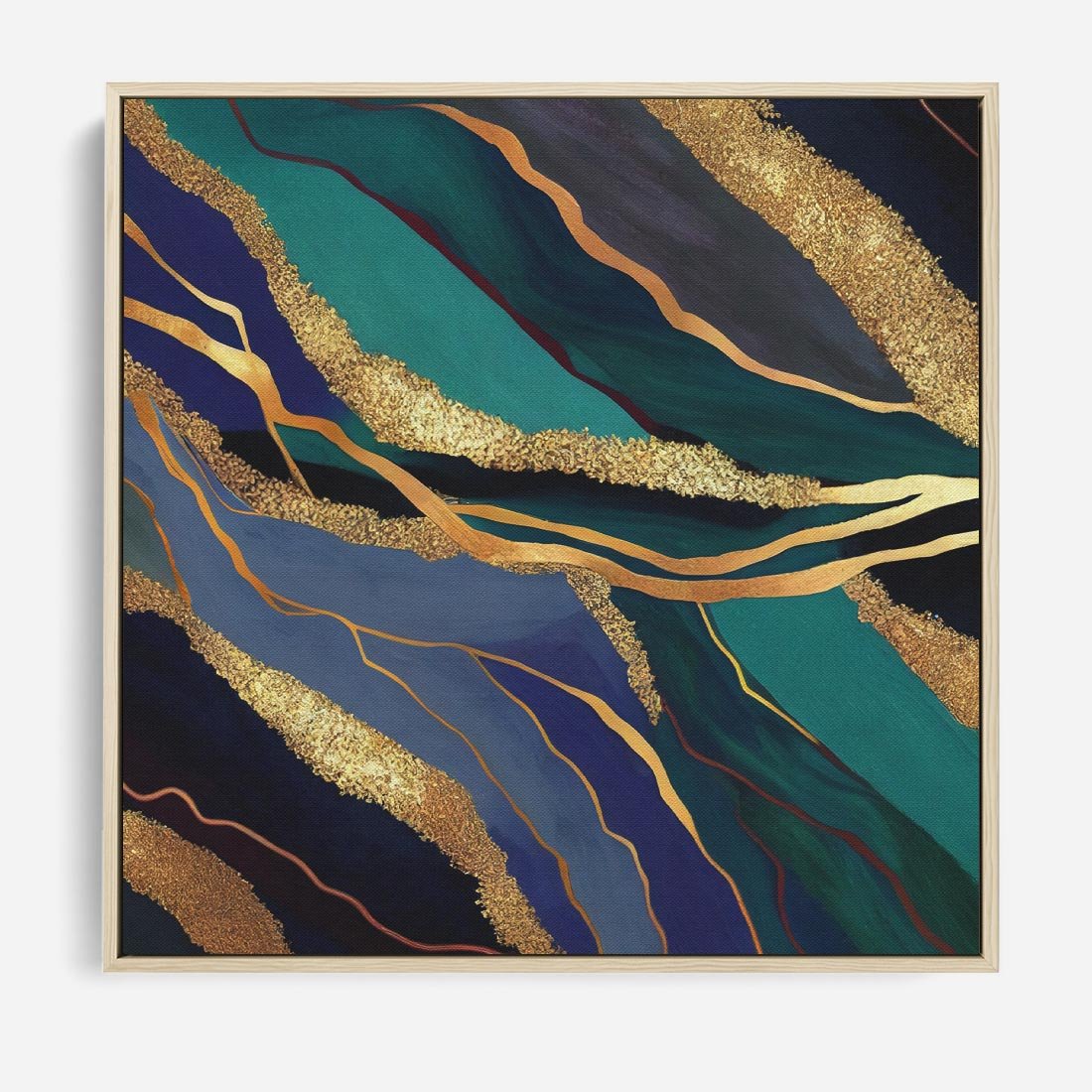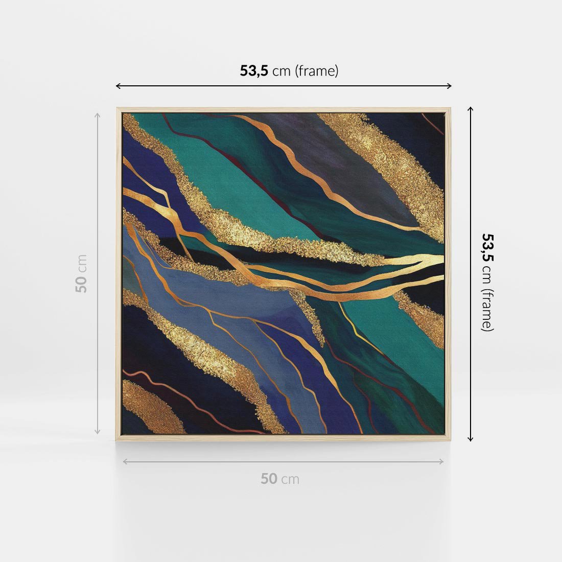 Zachwycaj się abstrakcyjną grafiką inspirowaną marmurem, wzbogaconą o intensywne kolory złota, zieleni i granatu. To wyjątkowe dzieło sztuki, stworzone dla osób ceniących elegancję i nowoczesność. Obraz emanuje luksusowym wdziękiem i będzie doskonałą dekoracją dla miłośników sztuki, pragnących unikalnego akcentu w swoich wnętrzach.