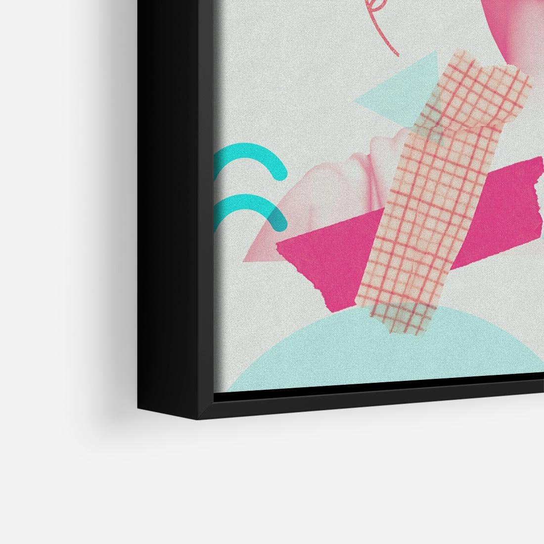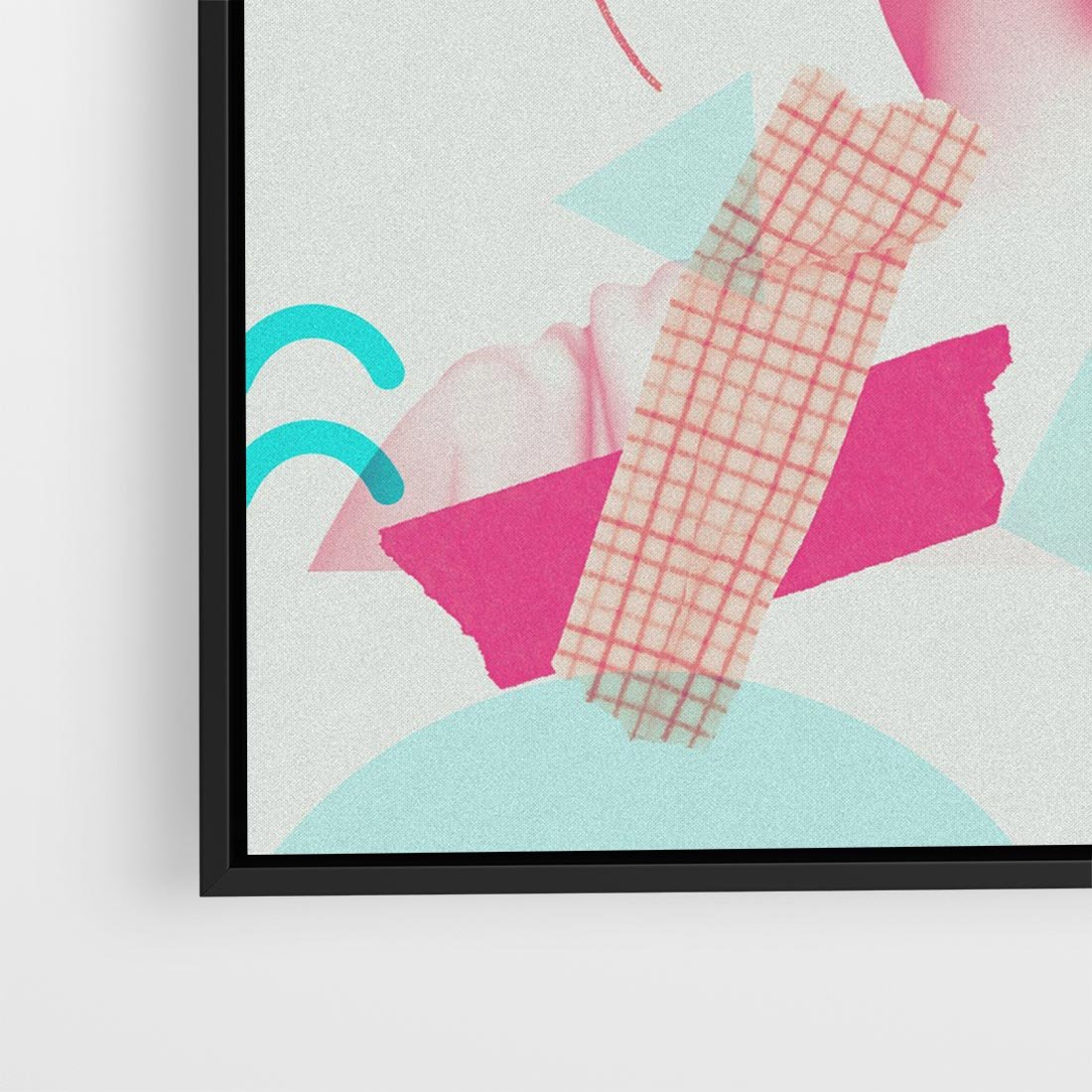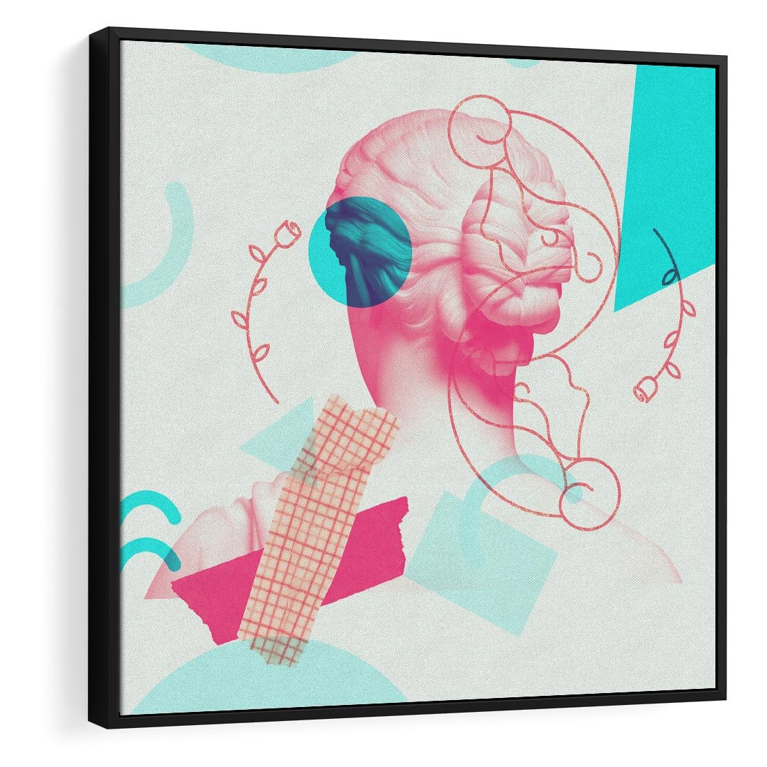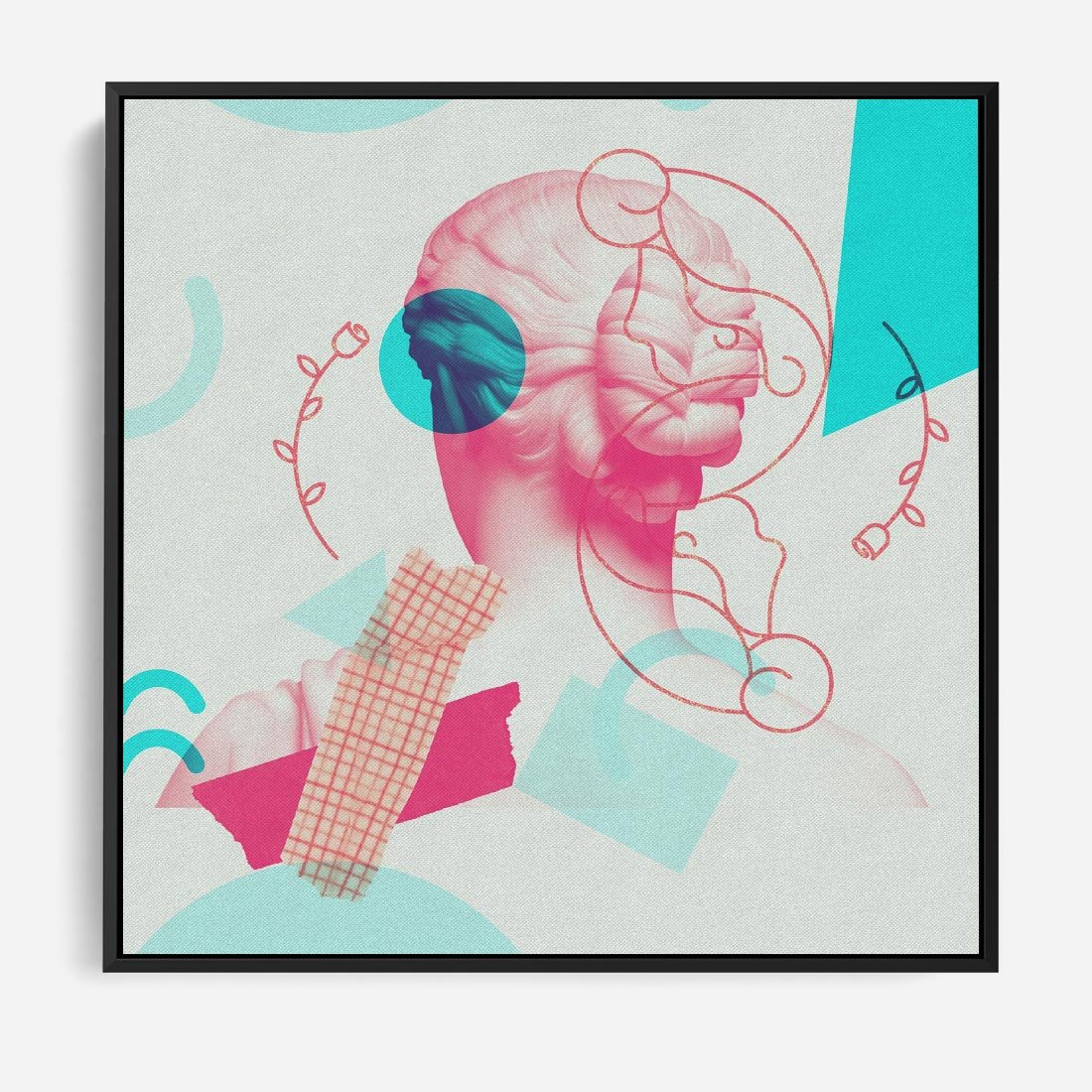 Ten nowoczesny kolaż łączy antyczną rzeźbę kobiety z elementami sztuki współczesnej. W delikatnych odcieniach różowego ukazuje piękno ludzkiej formy, przenosząc je w nowoczesny kontekst. To unikalne dzieło sztuki przyciąga wzrok i inspiruje do refleksji nad pięknem i ewolucją sztuki przez wieki.