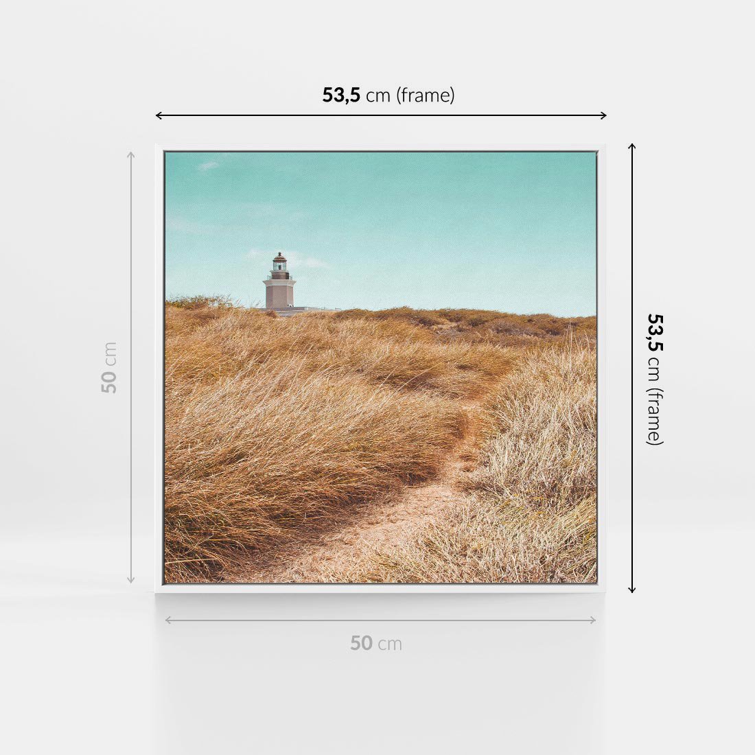 Obraz w ramie 50x50 - Tajemnicza Ścieżka - latarnia morska w oddali, suche trawy - rama biała