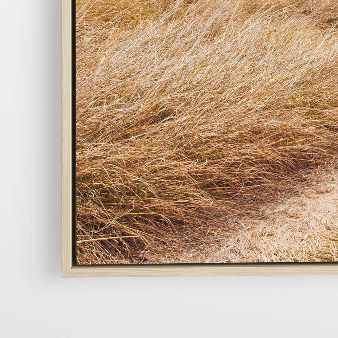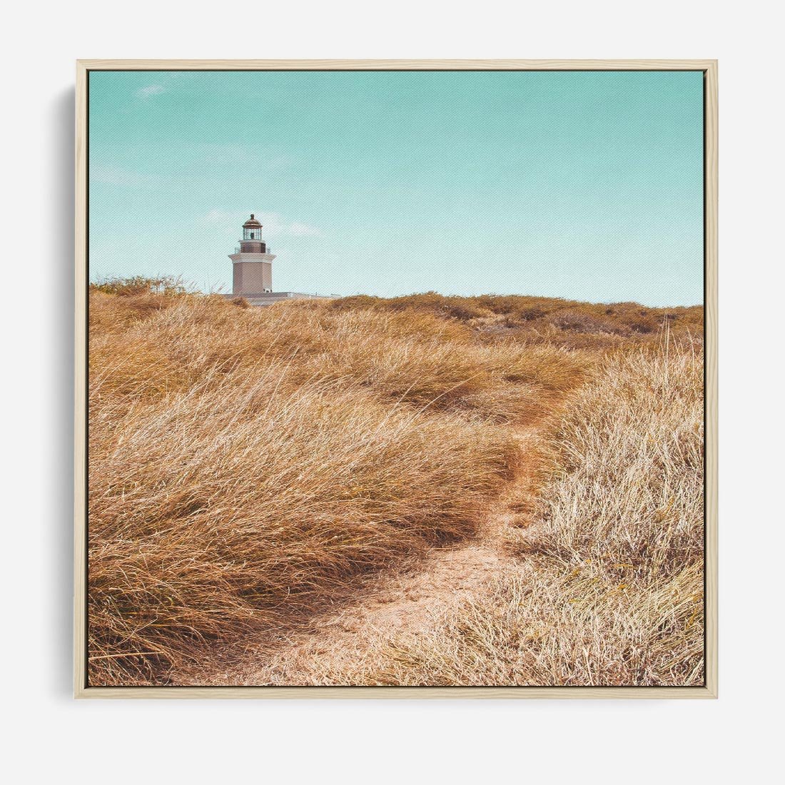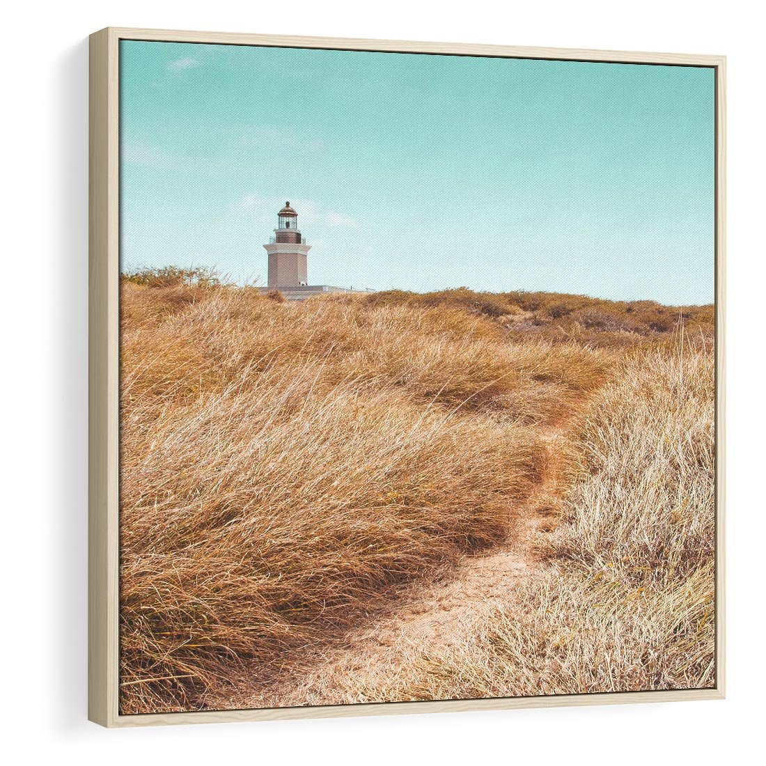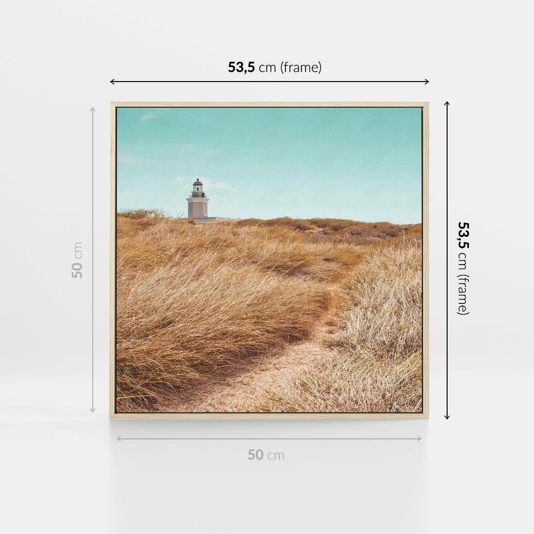 Obraz w ramie 50x50 - Tajemnicza Ścieżka - latarnia morska w oddali, suche trawy - rama drewno