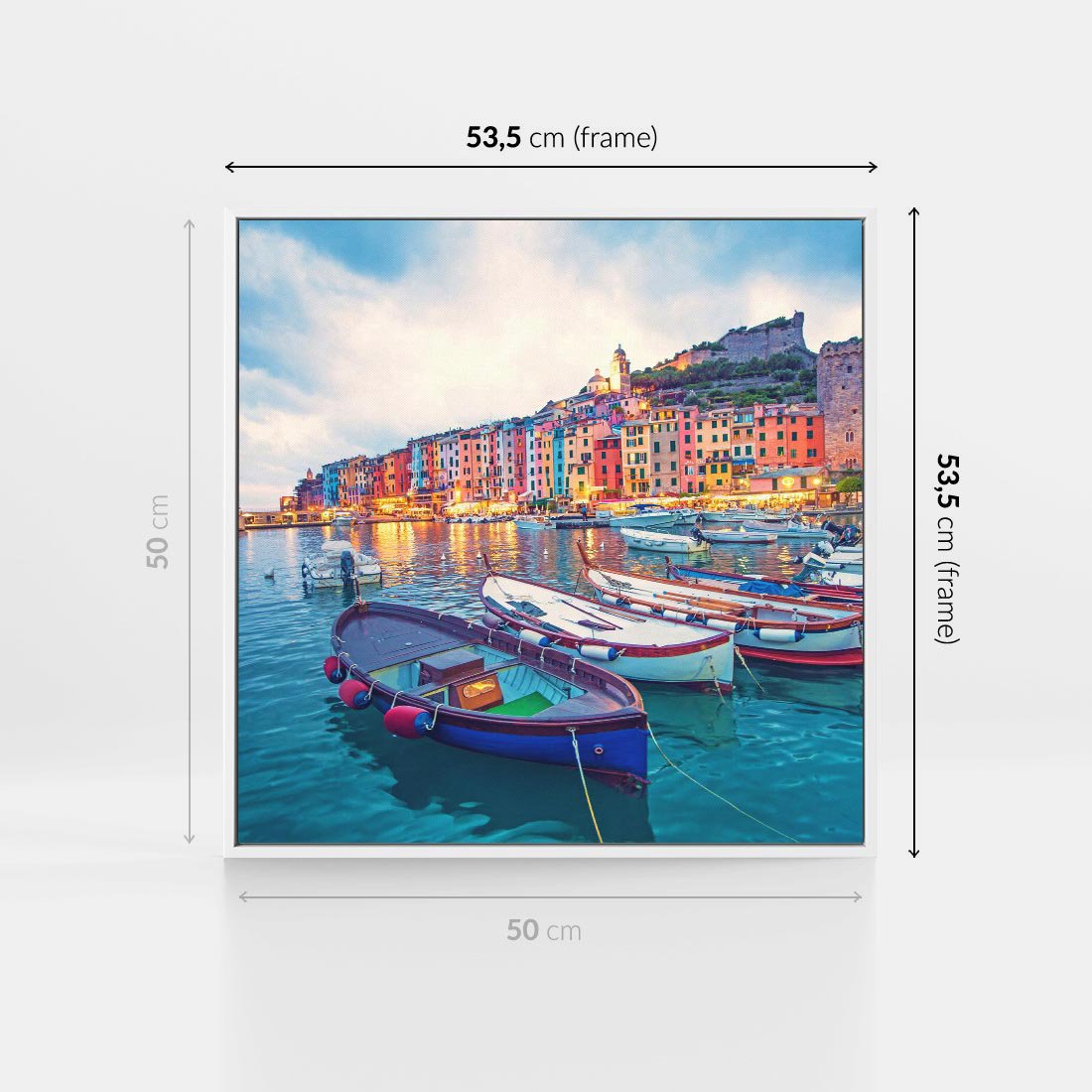 Obraz w ramie 50x50 - Tańczące kolory zachodu - nadmorskie kolorowe miast, kolorowe budynki na brzegu - rama biała