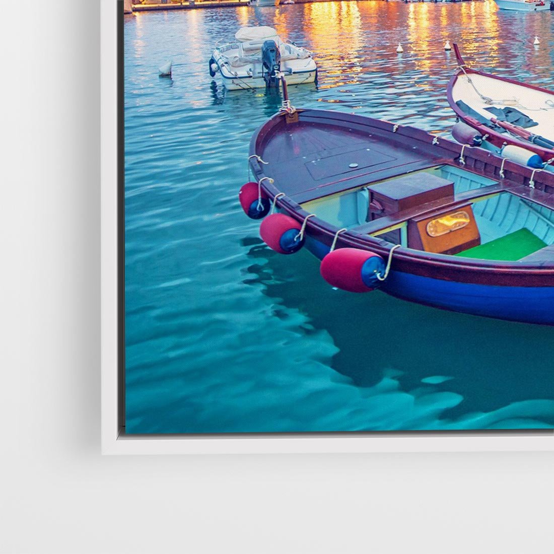 To malowniczy pejzaż przedstawiający nadmorskie miasto ożywione bogatą paletą barw. Budynki w jaskrawych kolorach zdobią brzeg, a port tętni życiem z kolorowymi łodziami. Wieczorne latarnie rozświetlają to idylliczne miejsce, nadając mu romantyczny nastrój. Ten obraz przenosi widza w magiczny krajobraz pełen kolorów i uroku nadmorskiego miasteczka. Idealny dla miłośników podróży i pięknych widoków.