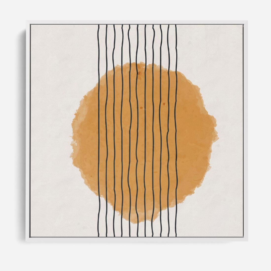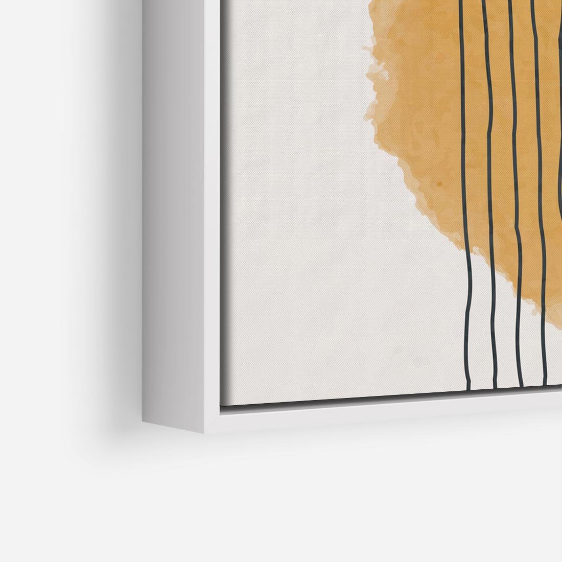 Intrygujący plakat przedstawia abstrakcyjne akwarelowe plamy w intensywnym żółtym kolorze, wzbogacone nieregularnymi kreskami i minimalistycznymi liniami. Nowoczesna sztuka w pełnej krasie.