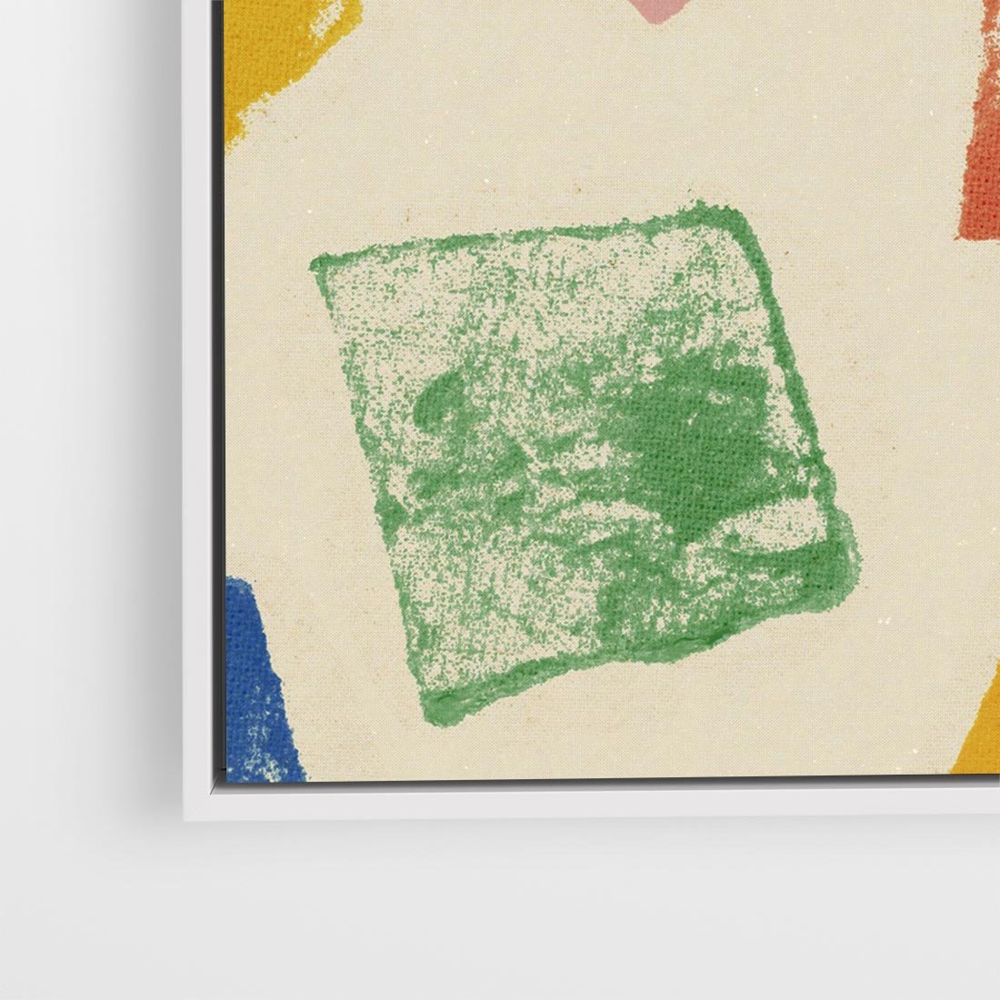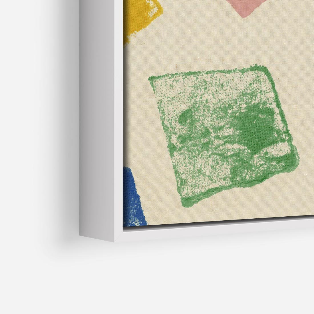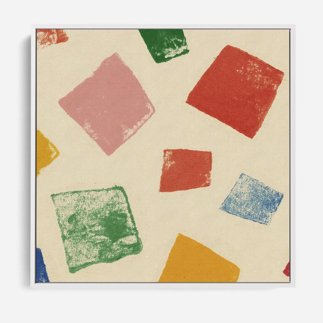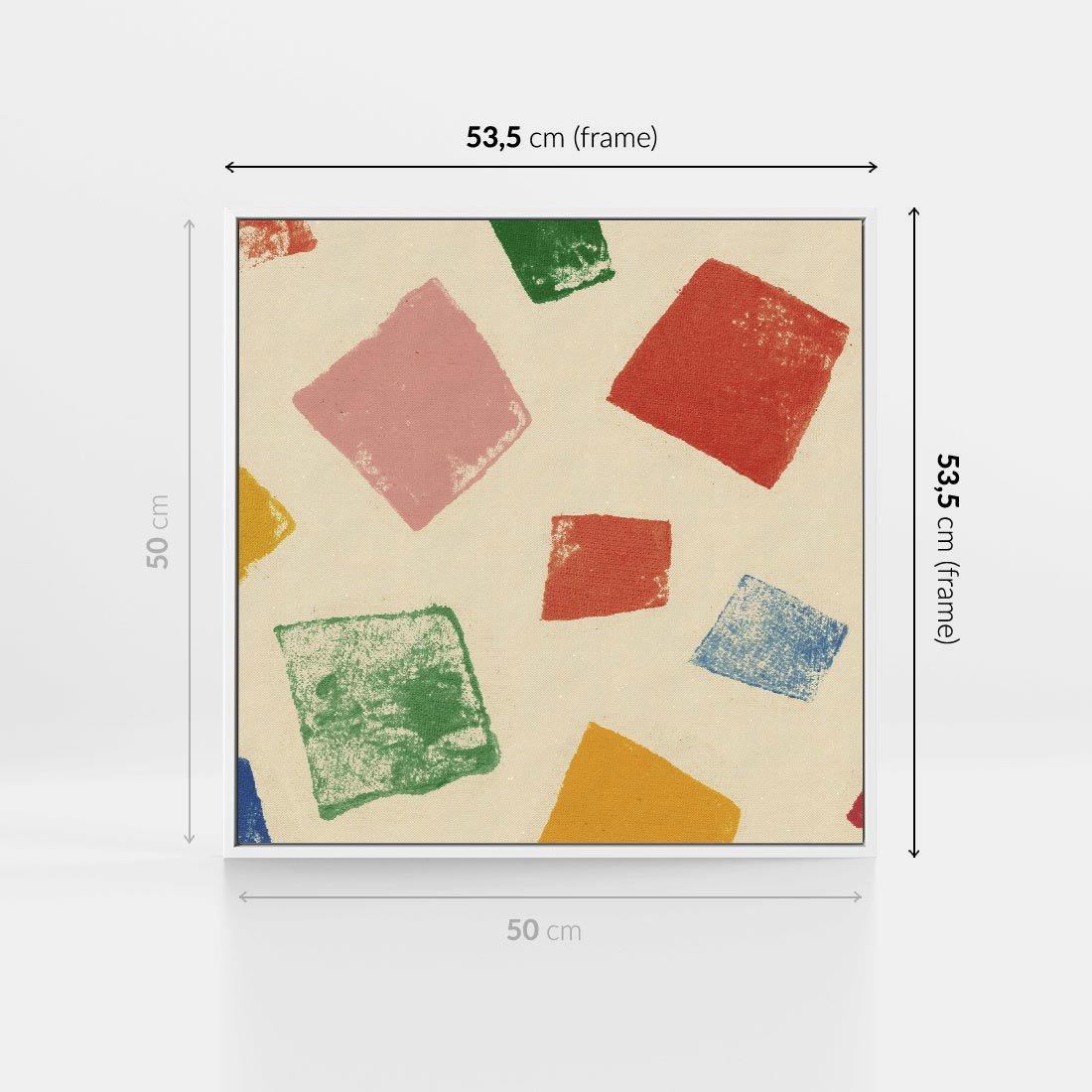 Ten wesoły kolaż to dynamiczna kompozycja kolorowych tęczowych kwadratów, które tworzą energetyczną harmonię. Wyraziste stemple dodają charakteru temu dziełu sztuki, które w pełni emanuje radością i pozytywnym wydźwiękiem.