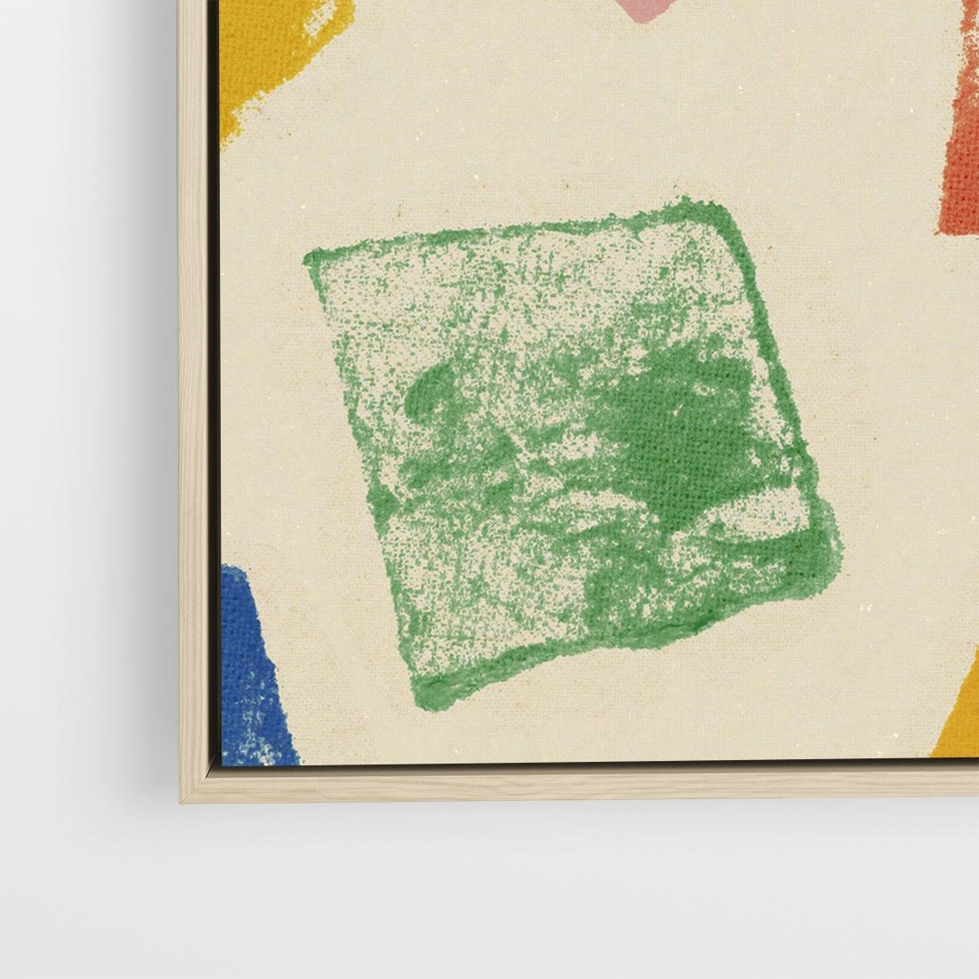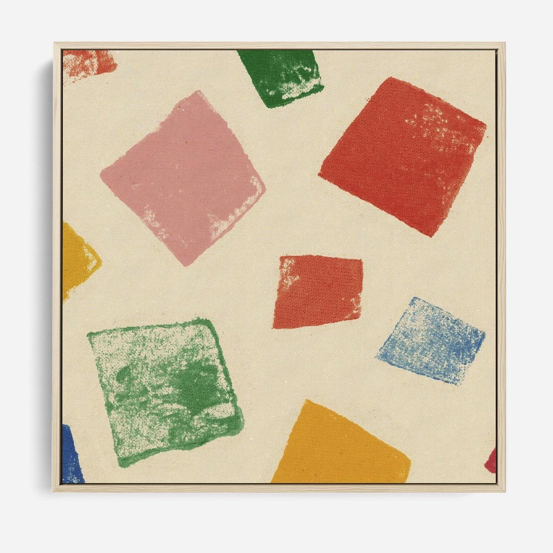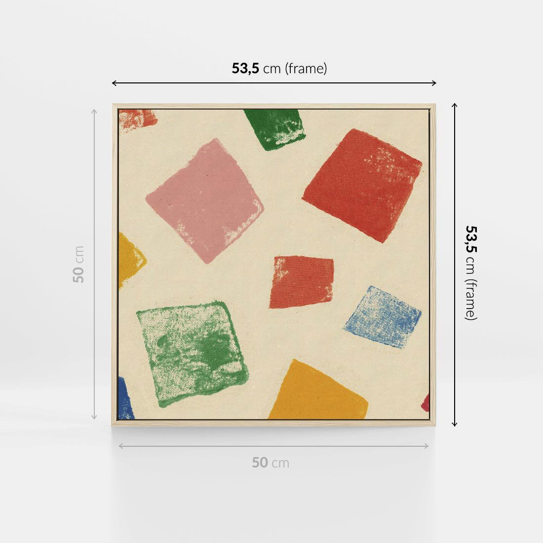 Ten wesoły kolaż to dynamiczna kompozycja kolorowych tęczowych kwadratów, które tworzą energetyczną harmonię. Wyraziste stemple dodają charakteru temu dziełu sztuki, które w pełni emanuje radością i pozytywnym wydźwiękiem.