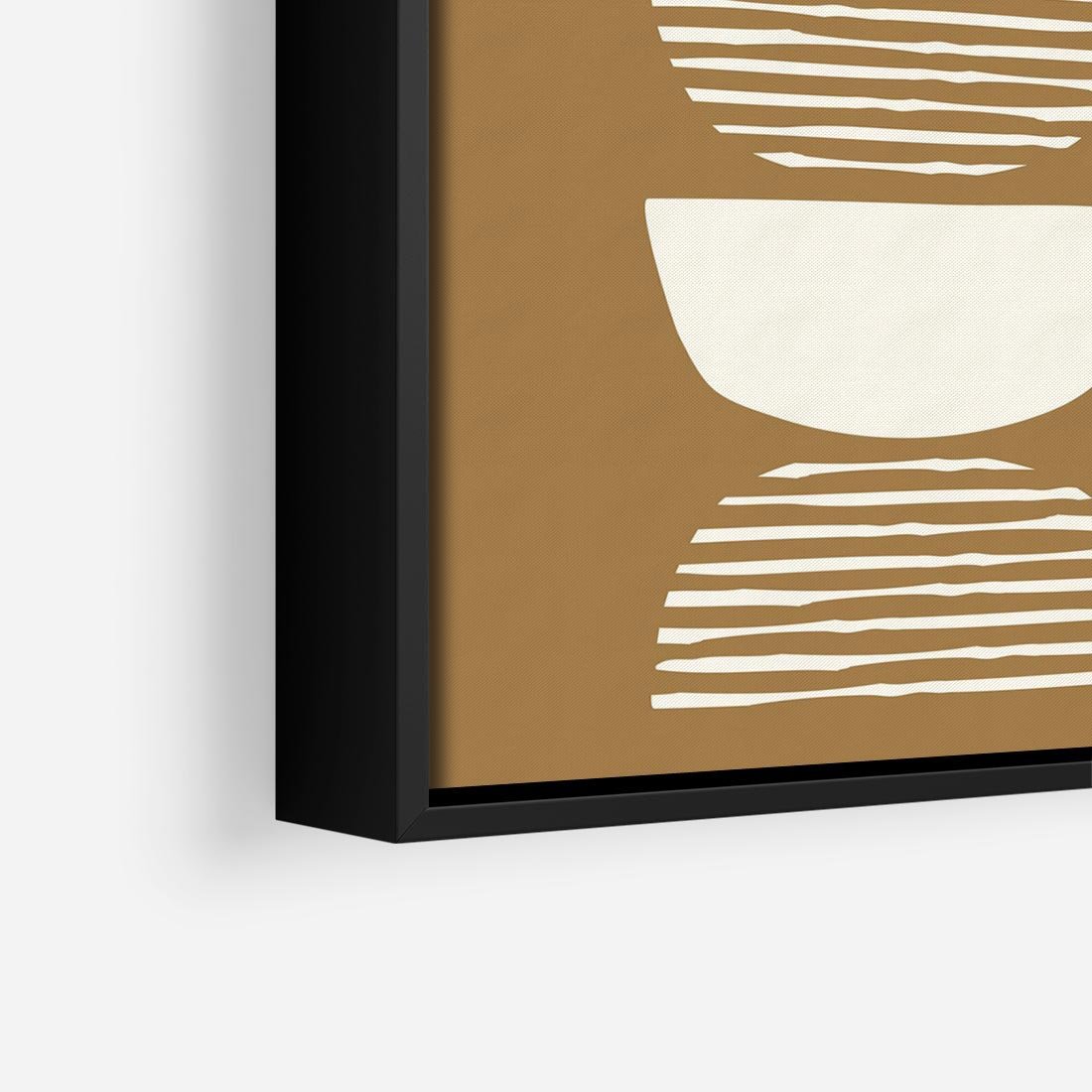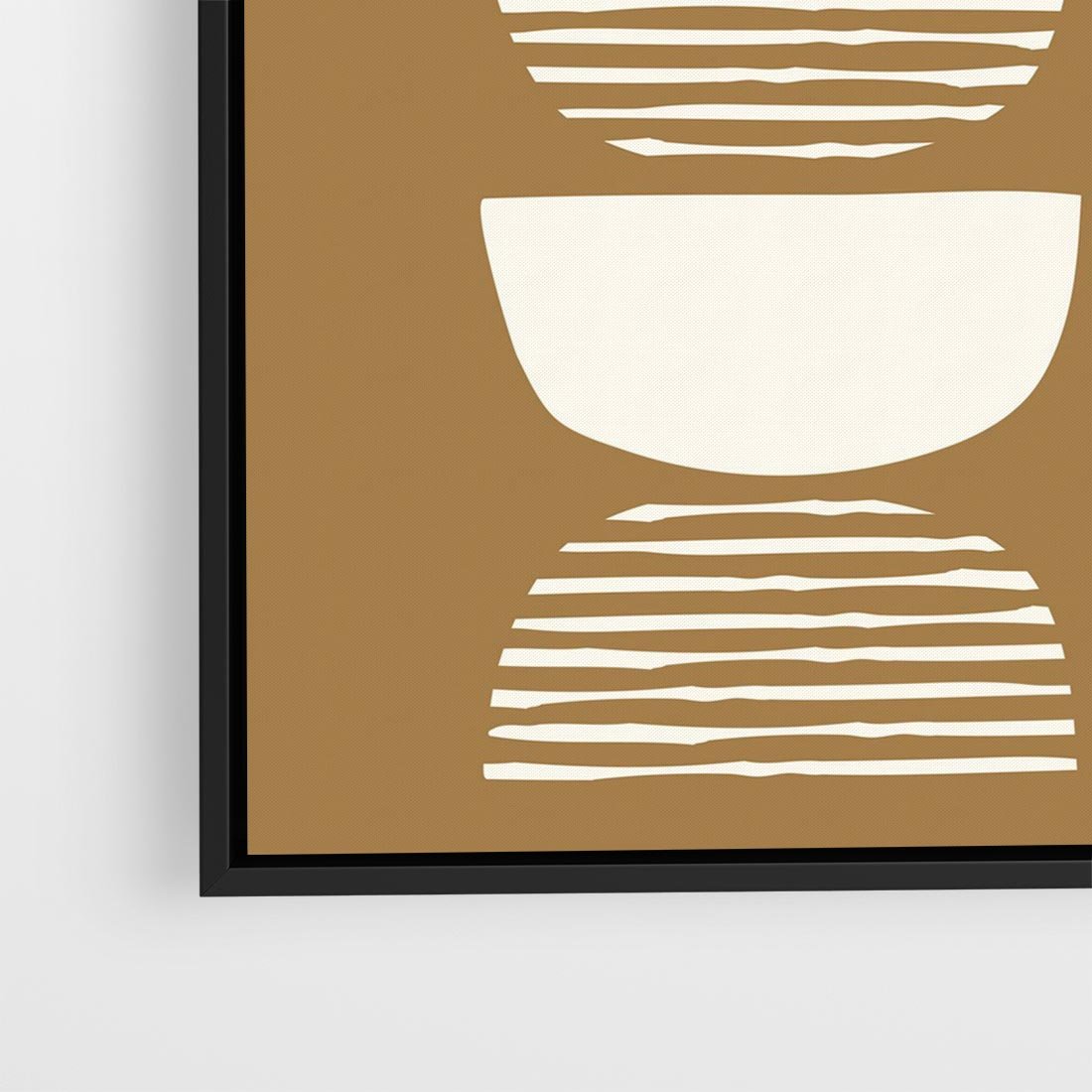 Ten plakat łączy geometryczne boho kształty z minimalistycznym podejściem, prezentując je na ciepłym brązowym, karmelowym tle. Sztuka ta tworzy harmonijną równowagę między różnymi stylami, wprowadzając do Twojej przestrzeni elegancki akcent, który emanuje spokojem i estetyką, doskonale wpisując się w minimalistyczne wnętrza.