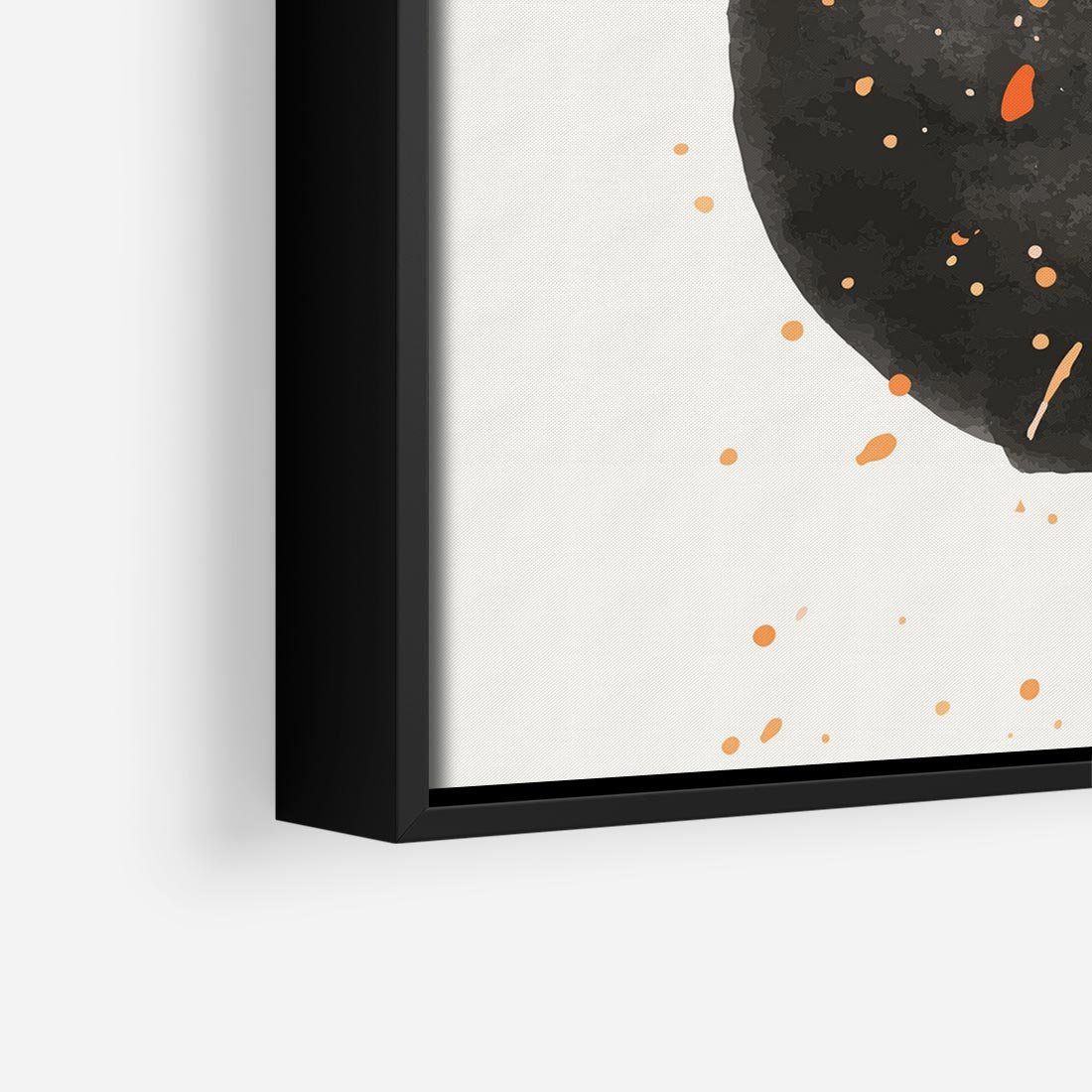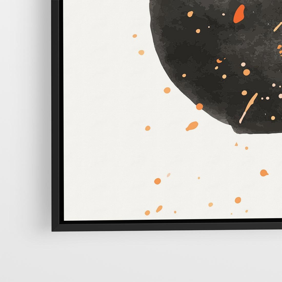 Oryginalny obraz to połączenie abstrakcyjnej czarnej plamy z delikatnie rozsianymi pomarańczowymi kropkami. Minimalistyczny styl i mocny akcent tworzą wyjątkową nowoczesną sztukę.