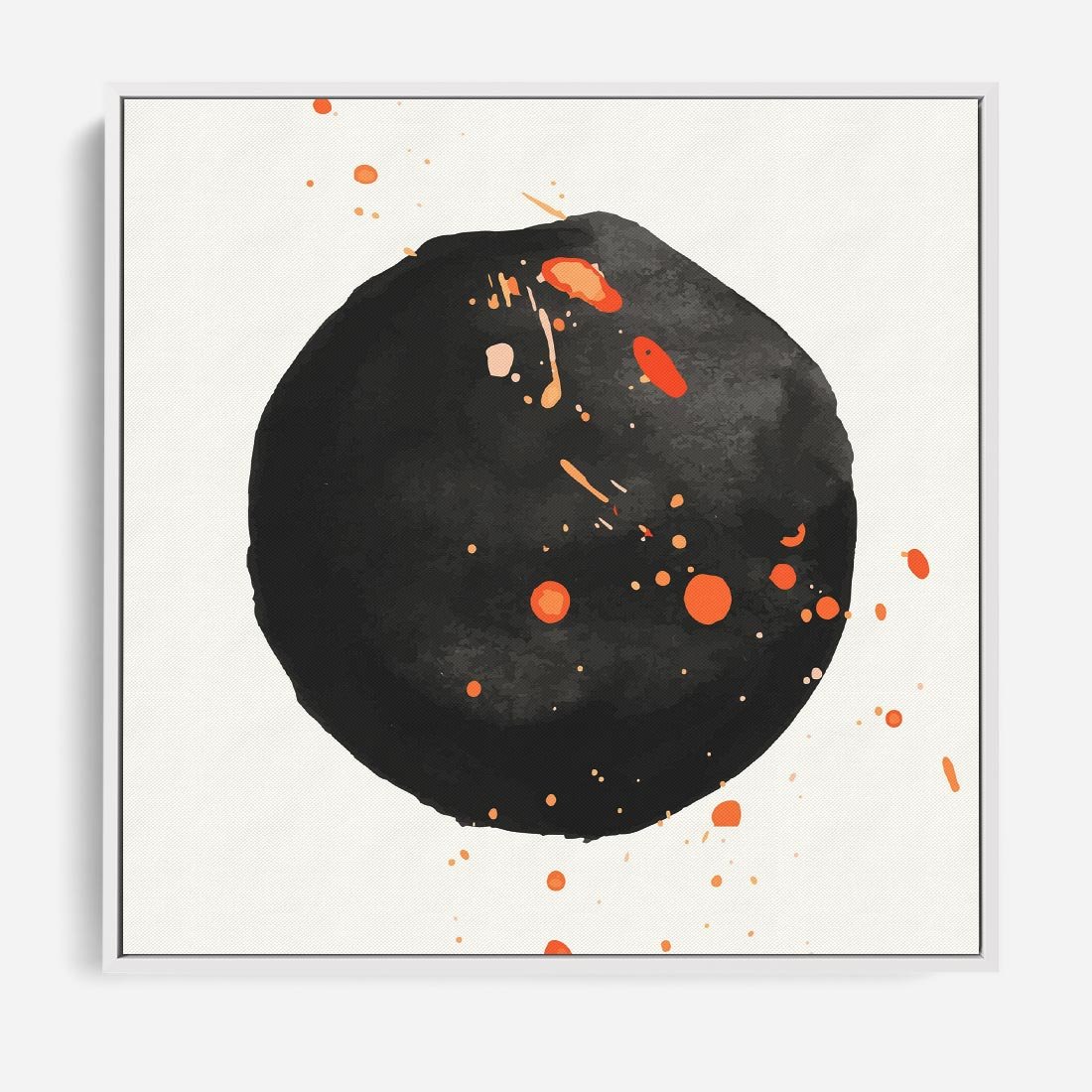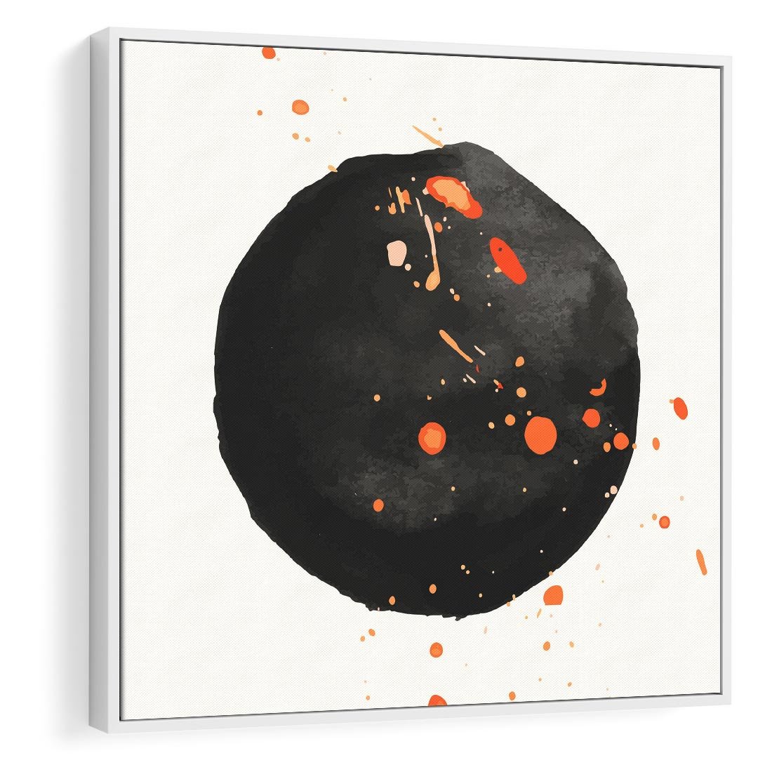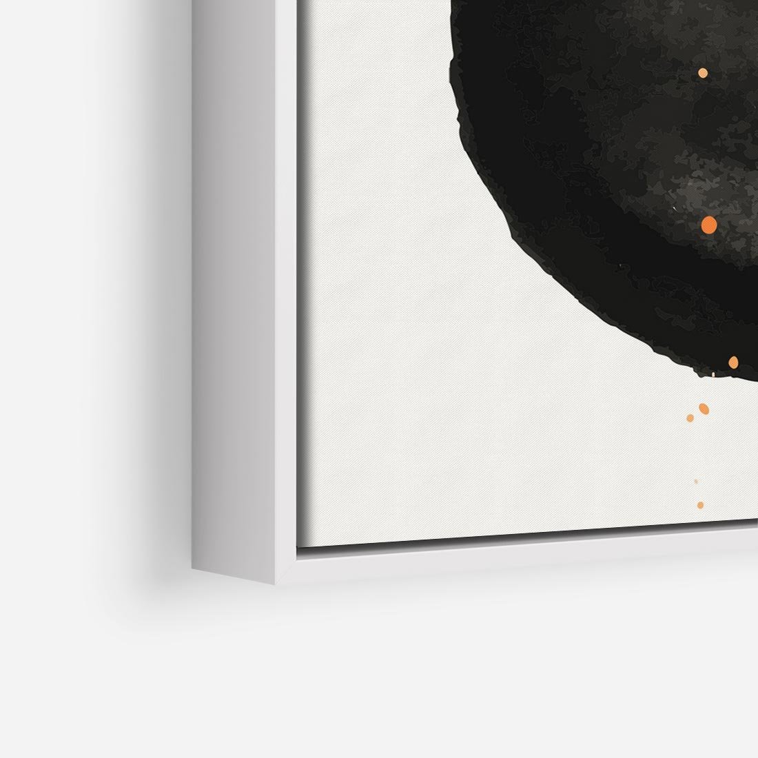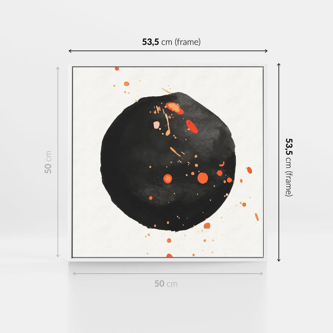 Obraz w ramie 50x50 - Wnętrza Marzeń - abstrakcyjna czarna plama, rozsiane pomarańczowe kropki - rama biała