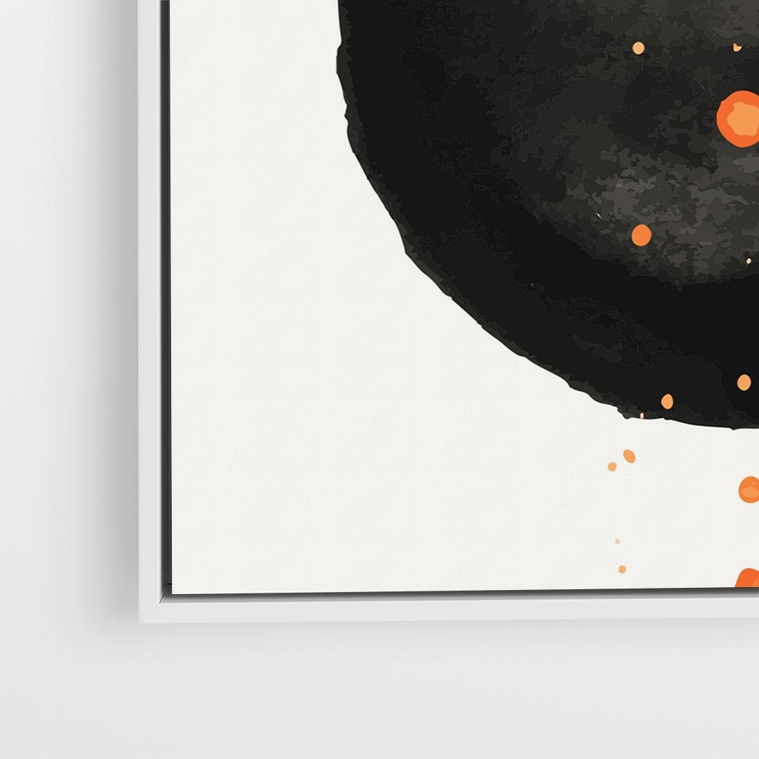Oryginalny obraz to połączenie abstrakcyjnej czarnej plamy z delikatnie rozsianymi pomarańczowymi kropkami. Minimalistyczny styl i mocny akcent tworzą wyjątkową nowoczesną sztukę.