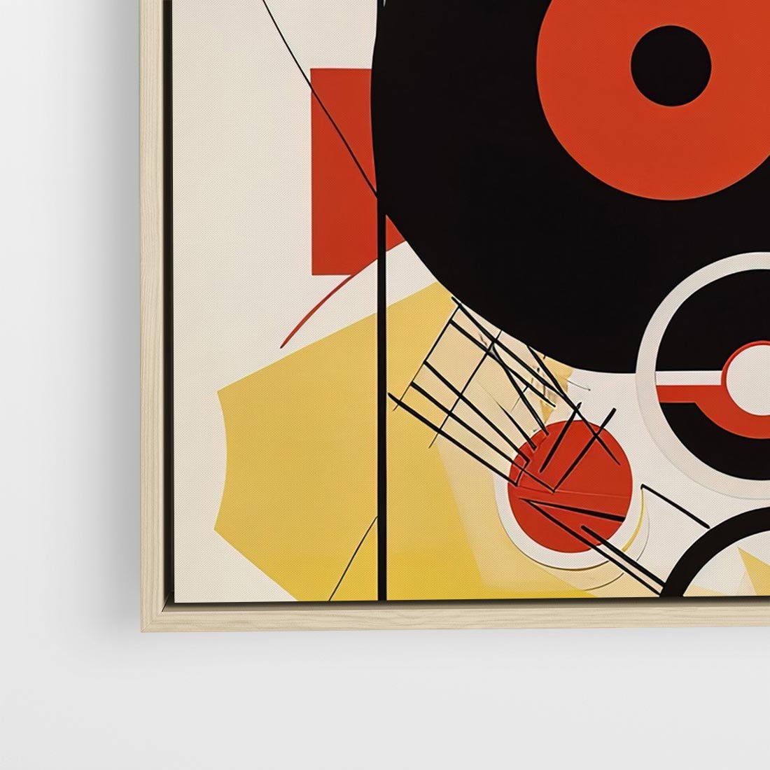 Ten modernistyczny obraz w stylu Bauhaus charakteryzuje się wyraźną geometrią, odważnymi kolorami i abstrakcyjną kompozycją. To hołd dla ducha kreatywności i eksperymentów znanego z ruchu Bauhaus.