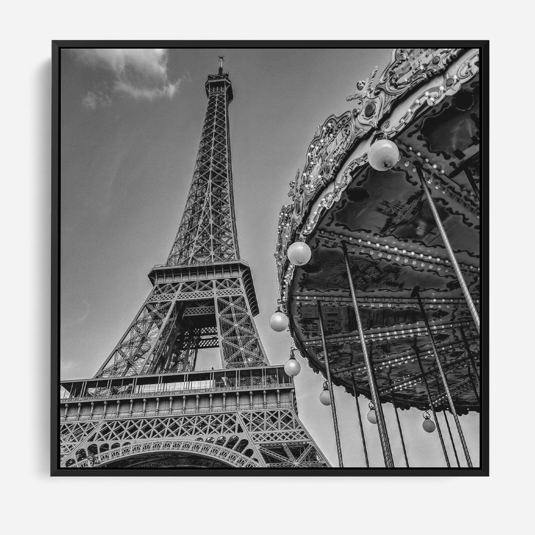 To czarno-białe zdjęcie przedstawia Wieżę Eiffla w Paryżu w towarzystwie urokliwej karuzeli. To ikoniczna scena z francuskiej stolicy, która łączy w sobie zarówno nowoczesność symbolizowaną przez wieżę, jak i klasyczną, nostalgiczną atmosferę karuzeli. To zdjęcie przenosi nas do magicznego świata Paryża, gdzie historia i nowoczesność spotykają się w niezwykły sposób. Jest to doskonała dekoracja dla tych, którzy pragną poczuć magię tego pięknego miasta.