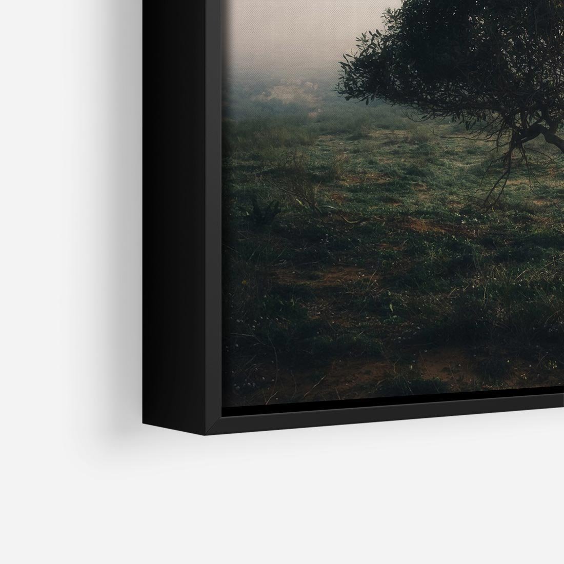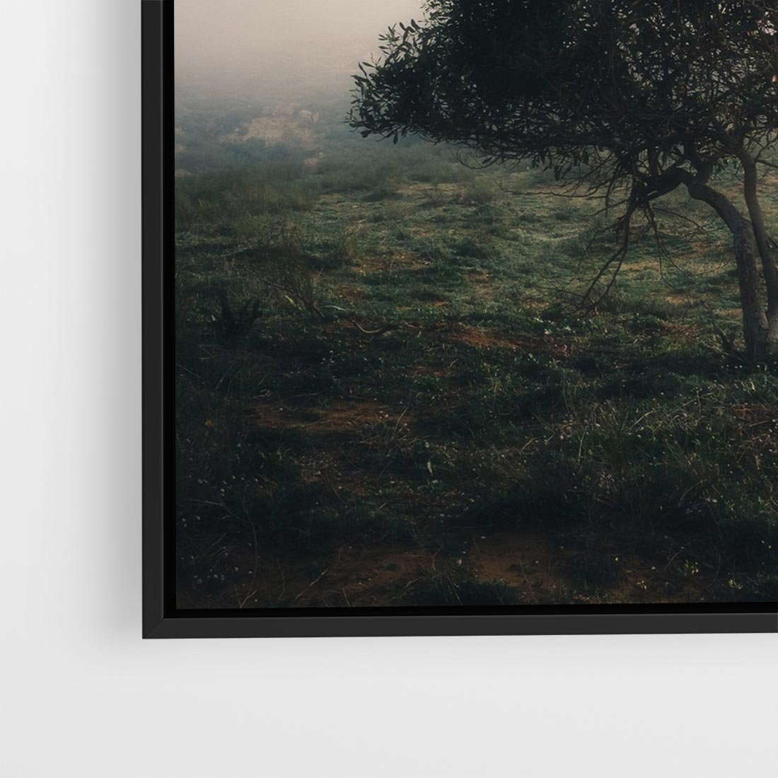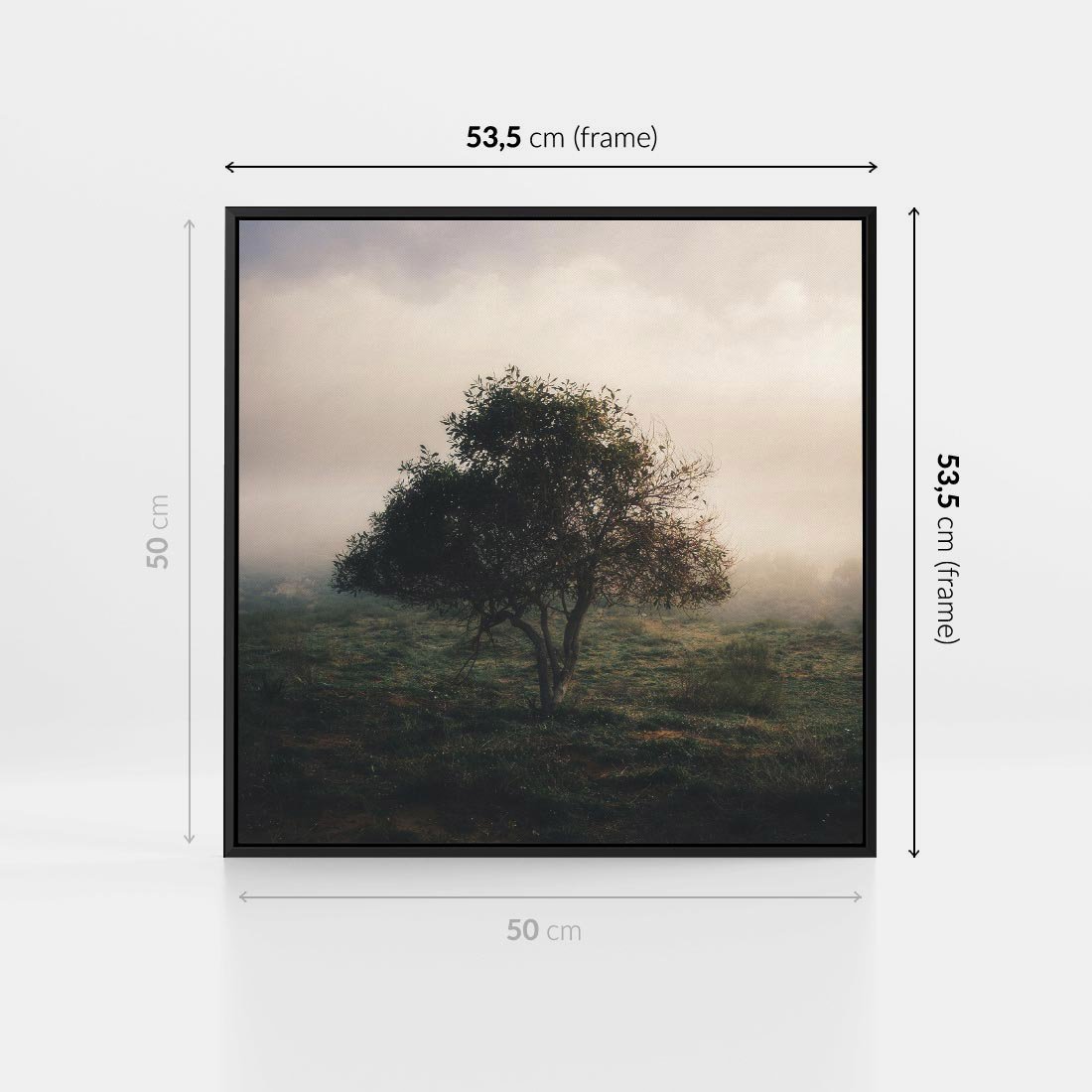 Obraz w ramie 50x50 - Zamglona Prostota - artystyczna fotografia, samotne drzewo na zamglonej łące - rama czarna