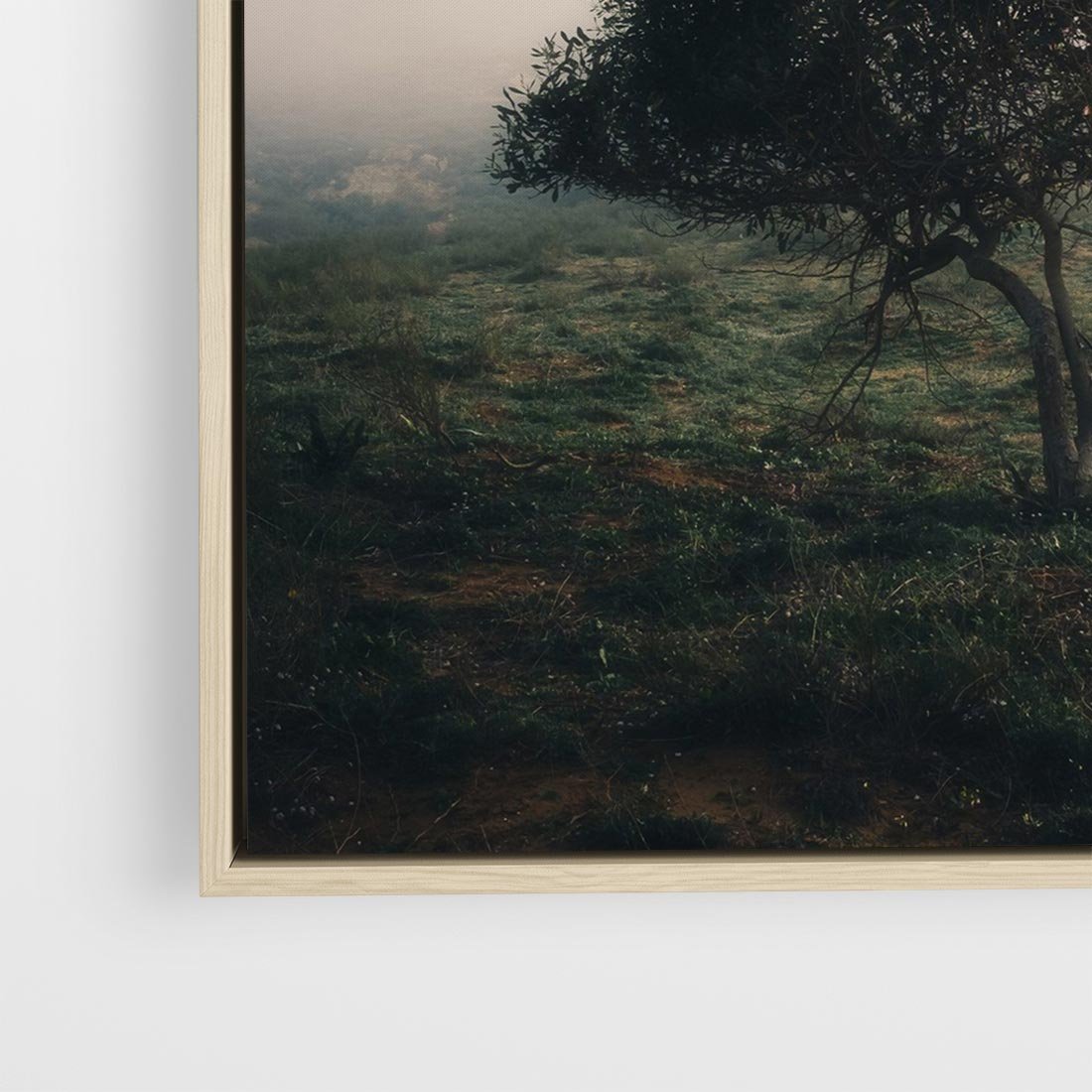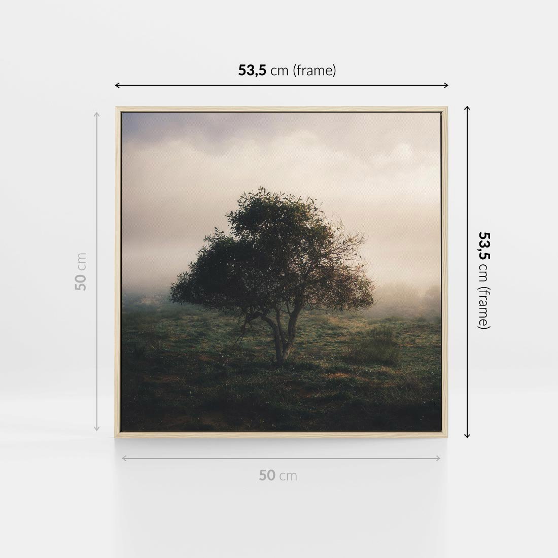 Obraz w ramie 50x50 - Zamglona Prostota - artystyczna fotografia, samotne drzewo na zamglonej łące - rama drewno