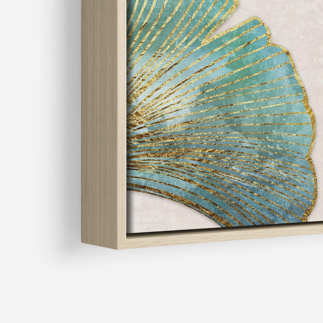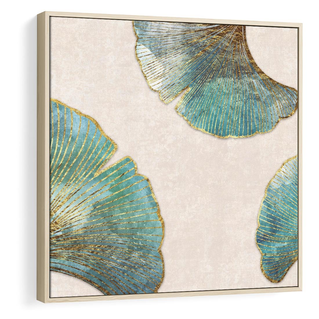 Obraz w ramie 50x50 - Złota Melodia Liści - złote, turkusowe liście miłorzębu - rama drewno