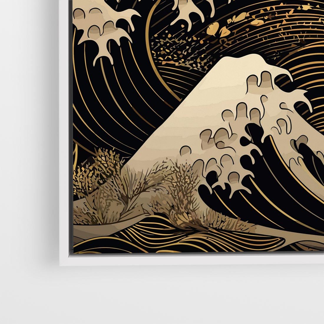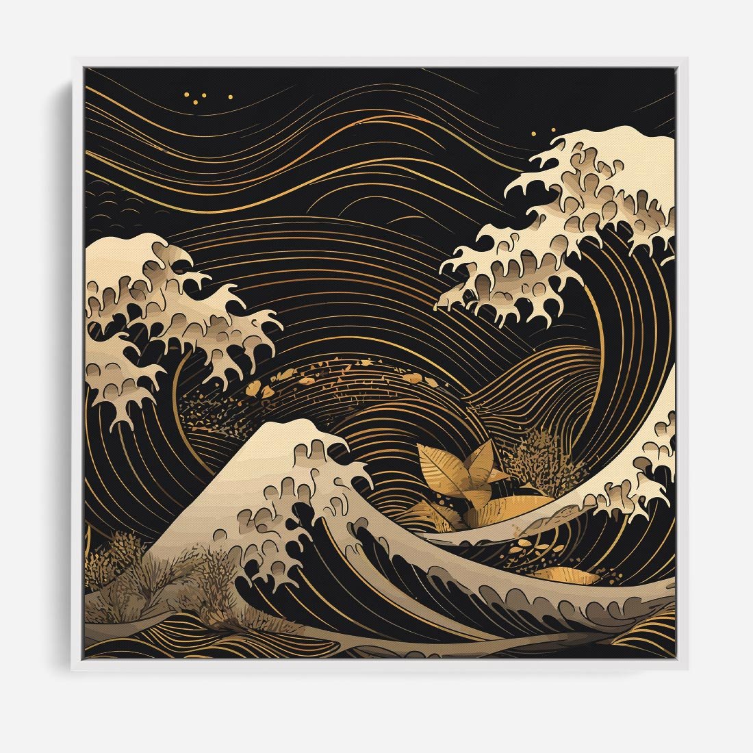 To ciemne malowidło na płótnie przenosi Cię do Japonii, ukazując fale morskie w graficznym stylu. Złote akcenty tworzą magiczny efekt, który ożywi Twoje wnętrze.