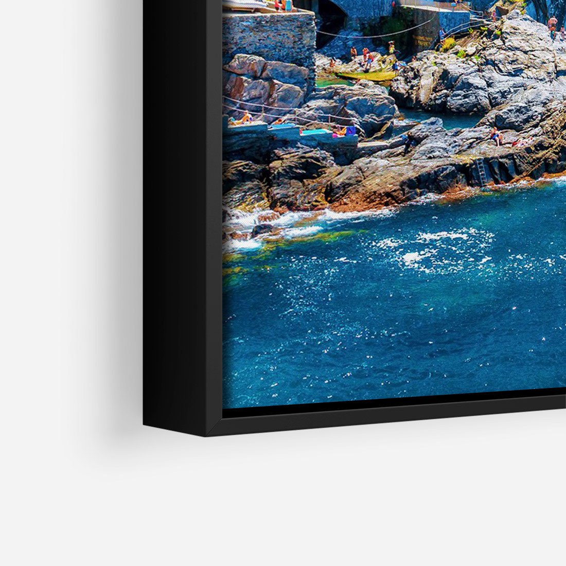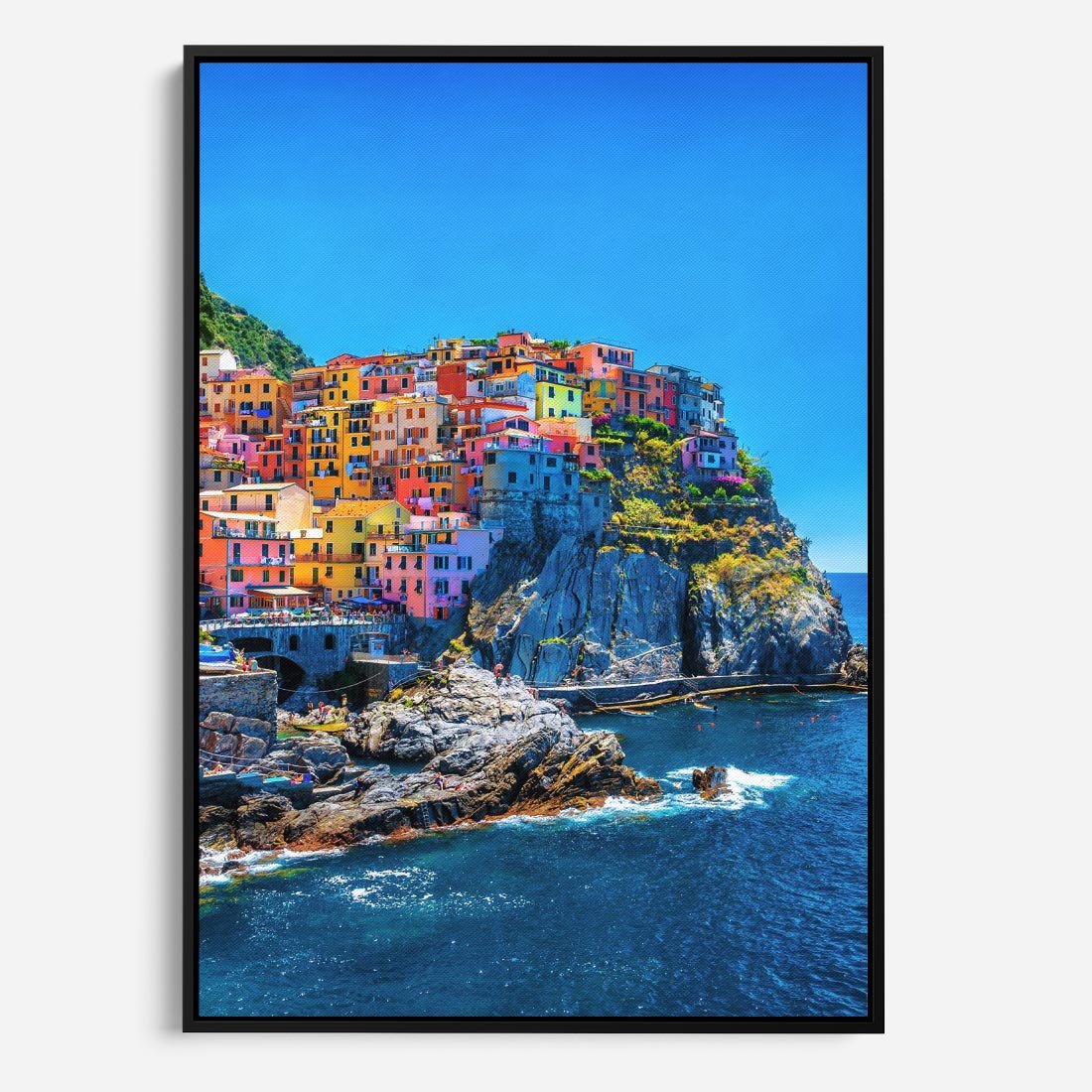 Obraz w ramie 50x70 - Barwne Wybrzeże - nadmorskie miasto na klifie, kolorowe tęczowe budynki - rama czarna