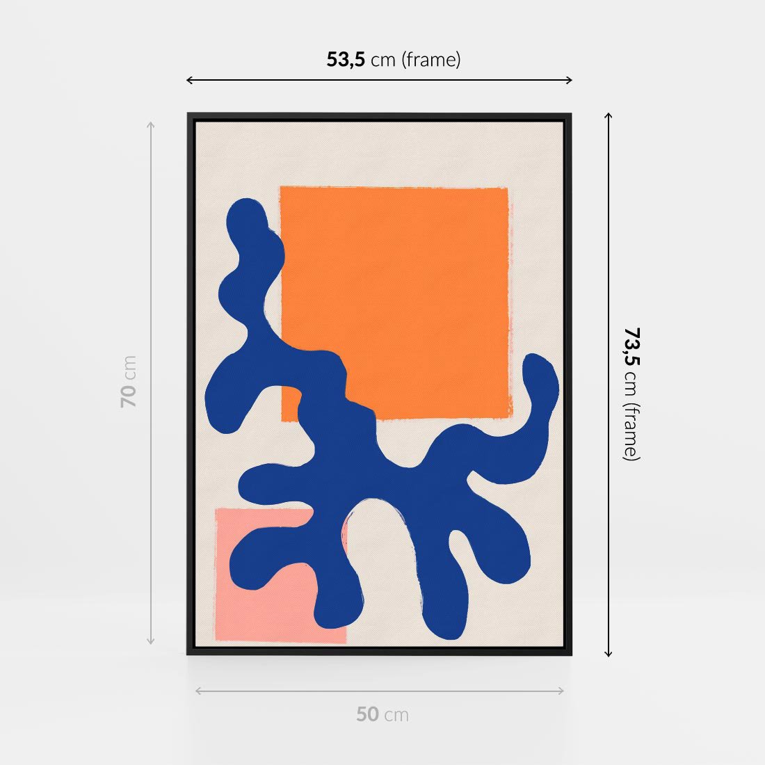 Ten nowoczesny plakat prezentuje abstrakcyjne geometryczne kształty w intensywnych kolorach pomarańczowym i granatowym. To dzieło sztuki wnosi do Twojej przestrzeni nowoczesny charakter i ekspresyjność. Idealny wybór dla tych, którzy cenią sobie sztukę abstrakcyjną i dynamiczne kompozycje kolorystyczne.