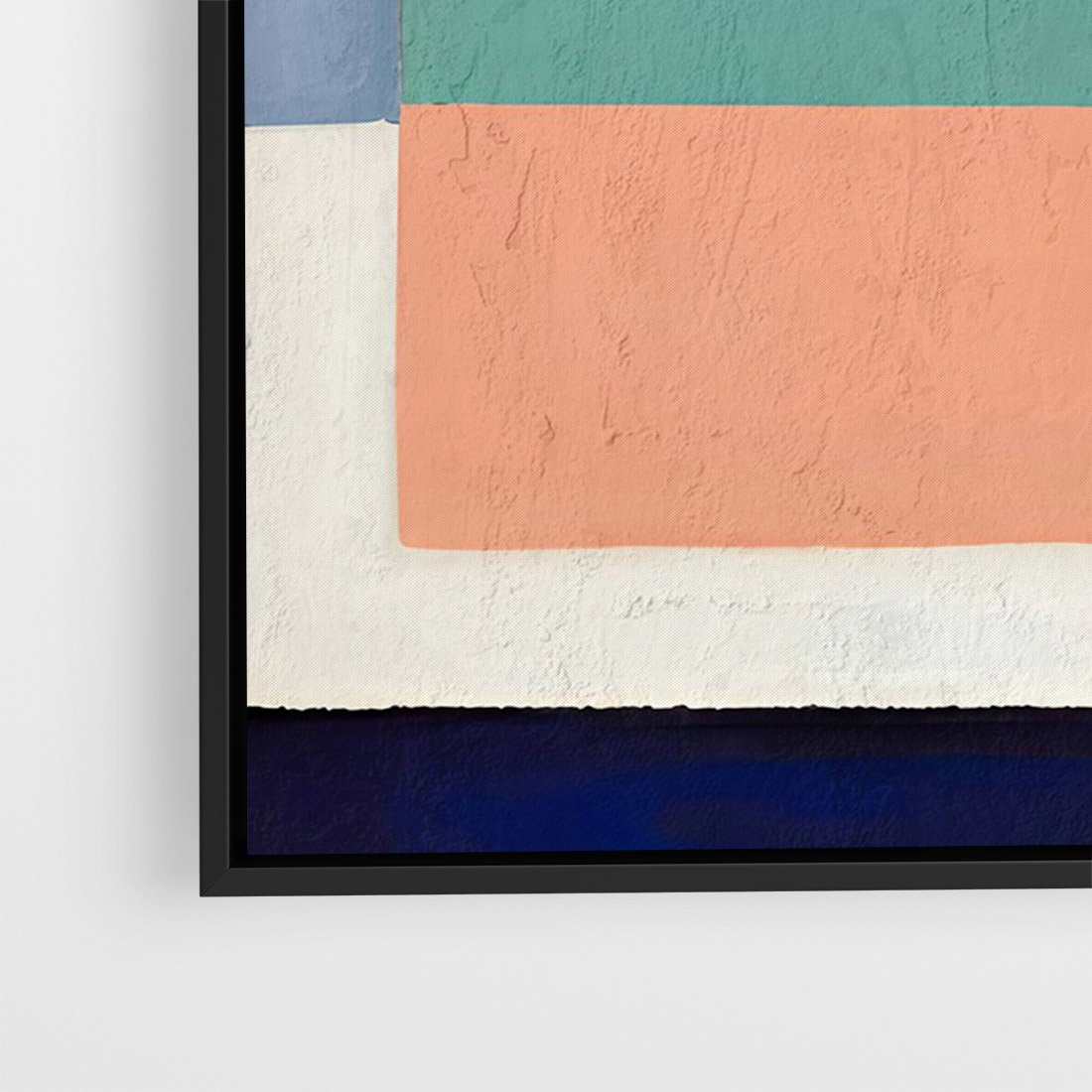 To olejny obraz o abstrakcyjnych geometrycznych kształtach, w których dominują pastelowe kolory. Prostokąty i kwadraty tworzą harmonijną kompozycję, która zachwyca swoją subtelnością i równowagą.