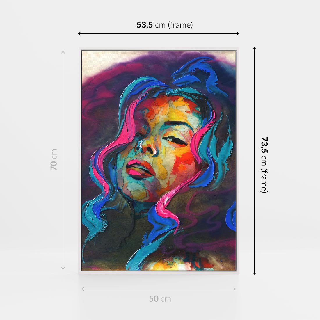 Ta dynamiczna grafika komputerowa odbiega od tradycyjnych portretów i prezentuje abstrakcyjną formę kobiety z bujnymi, intensywnie kolorowymi włosami. Wizualna siła obrazu przypomina olejne malarstwo, co nadaje mu wyjątkowego uroku. To niezwykłe dzieło sztuki pomoże ożywić przestrzeń i przyciągnie uwagę miłośników zarówno sztuki tradycyjnej, jak i współczesnej.