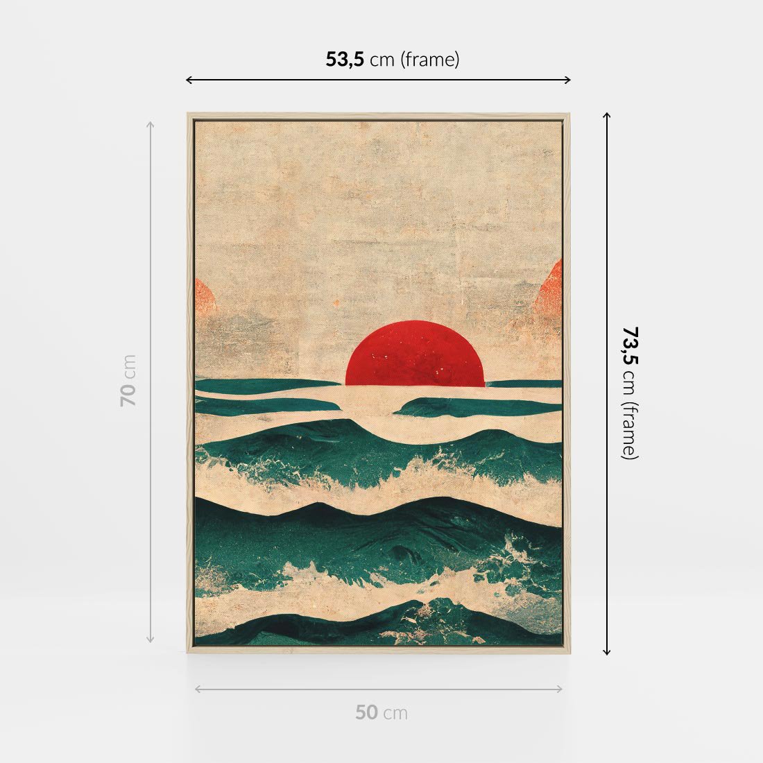 Japońska sztuka na płótnie, która przenosi nas w świat spokoju i harmonii. Widok zachodu słońca nad oceanem malowany na starym papirusie emanuje mistycznym urokiem. Styl japandi, charakteryzujący się minimalistycznym pięknem, doskonale współgra z dynamiką fal. Czerwone słońce nadaje obrazowi wyjątkowego nastroju, przenosząc nas w pejzaż dalekiej Japonii. To dzieło sztuki, które oczarowuje i zachwyca.