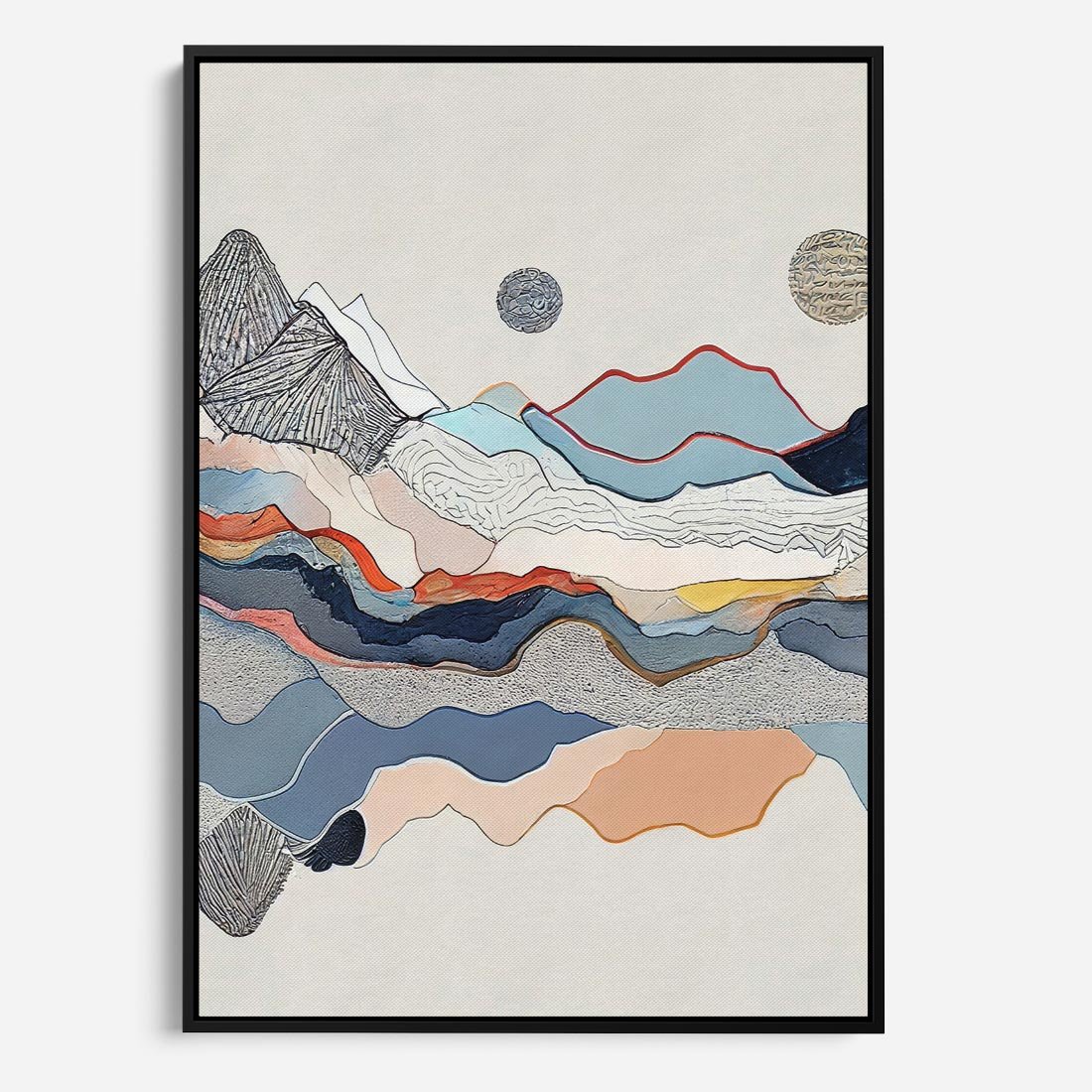 To akwarelowe malowidło łączy graficzne góry z różnymi teksturami, tworząc dynamiczną reprezentację natury. Nowoczesna abstrakcja pasuje do każdego wnętrza, dodając wyjątkowy i inspirujący akcent.