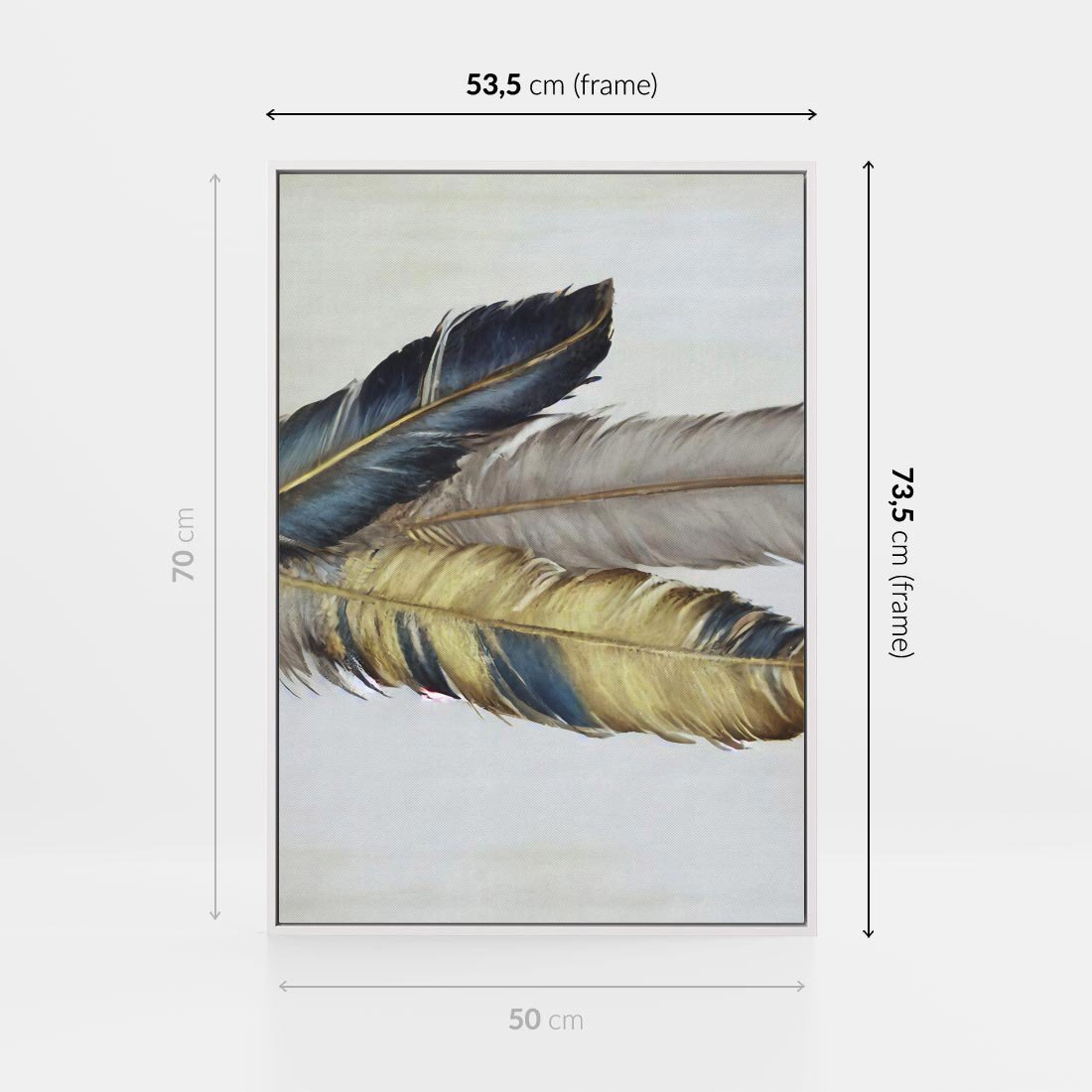Ten unikatowy obraz przedstawia granatowe i złote pióra w stylu boho. Sztuka ta emanuje swobodą i egzotycznym wdziękiem, przyciągając wzrok swoją oryginalnością. Wyraziste kolory i piękno piór wkomponowane w dzieło sztuki dodają przestrzeni wyjątkowego charakteru i artystycznego stylu, idealnego dla miłośników boho.