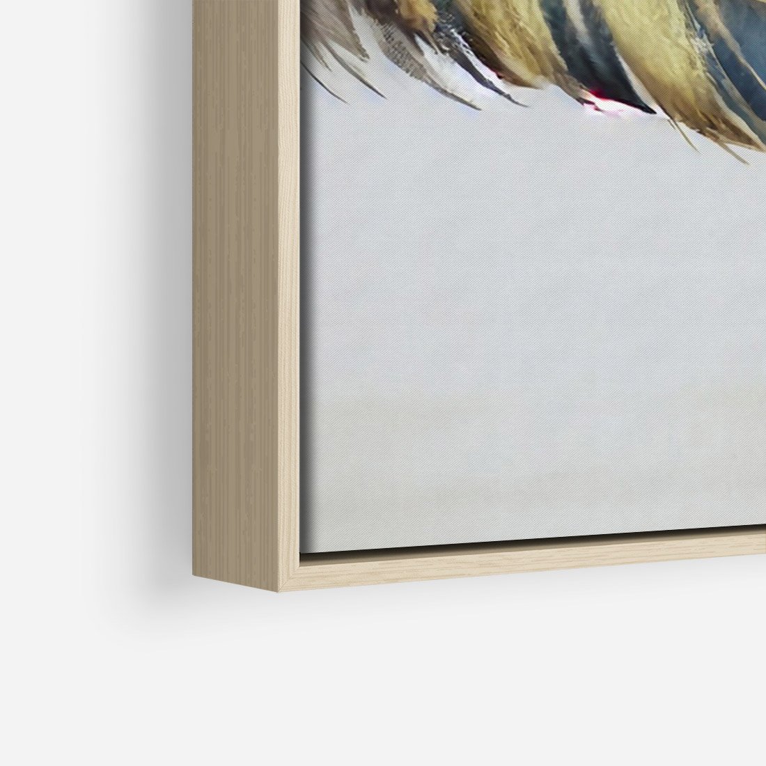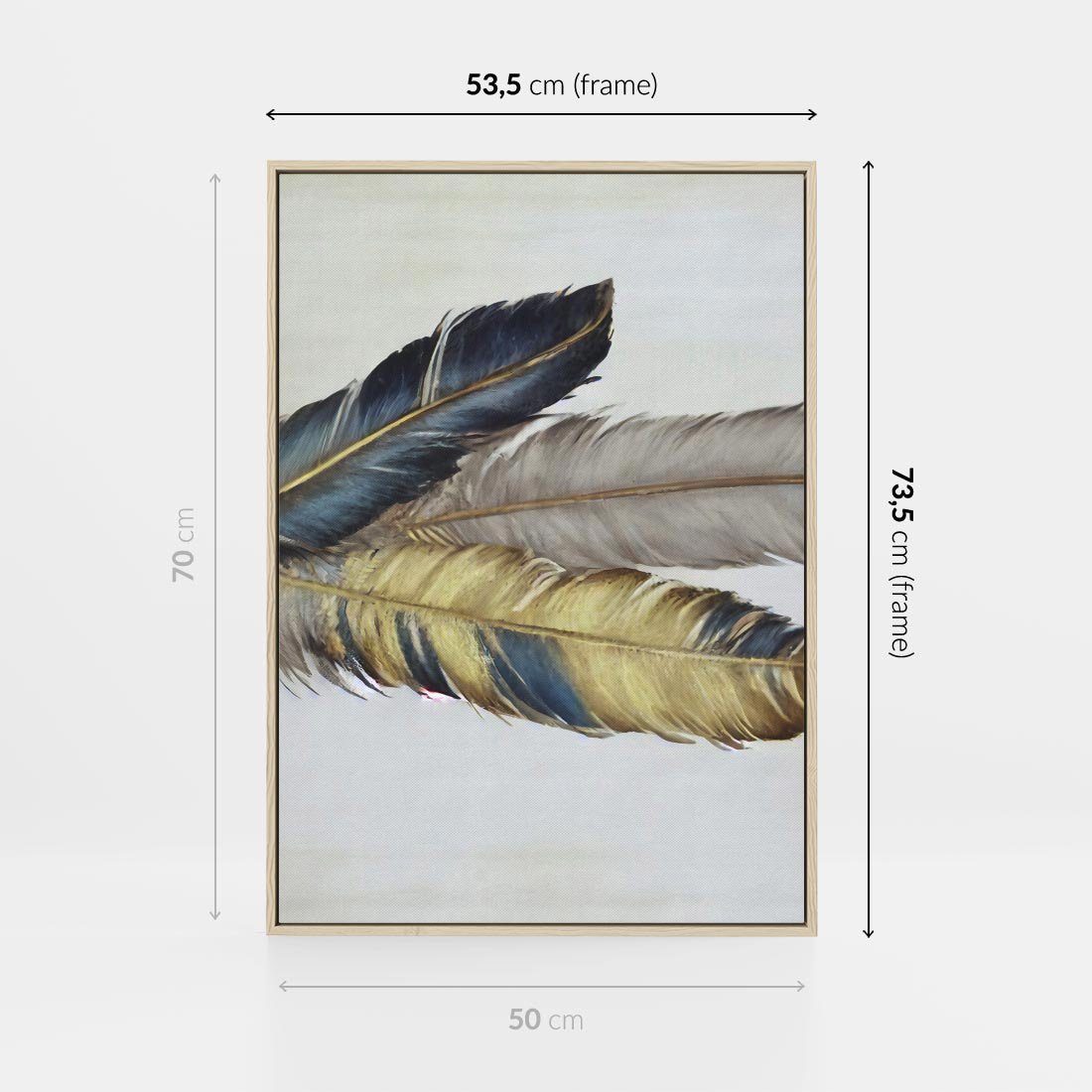 Ten unikatowy obraz przedstawia granatowe i złote pióra w stylu boho. Sztuka ta emanuje swobodą i egzotycznym wdziękiem, przyciągając wzrok swoją oryginalnością. Wyraziste kolory i piękno piór wkomponowane w dzieło sztuki dodają przestrzeni wyjątkowego charakteru i artystycznego stylu, idealnego dla miłośników boho.