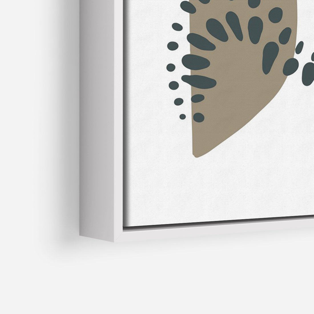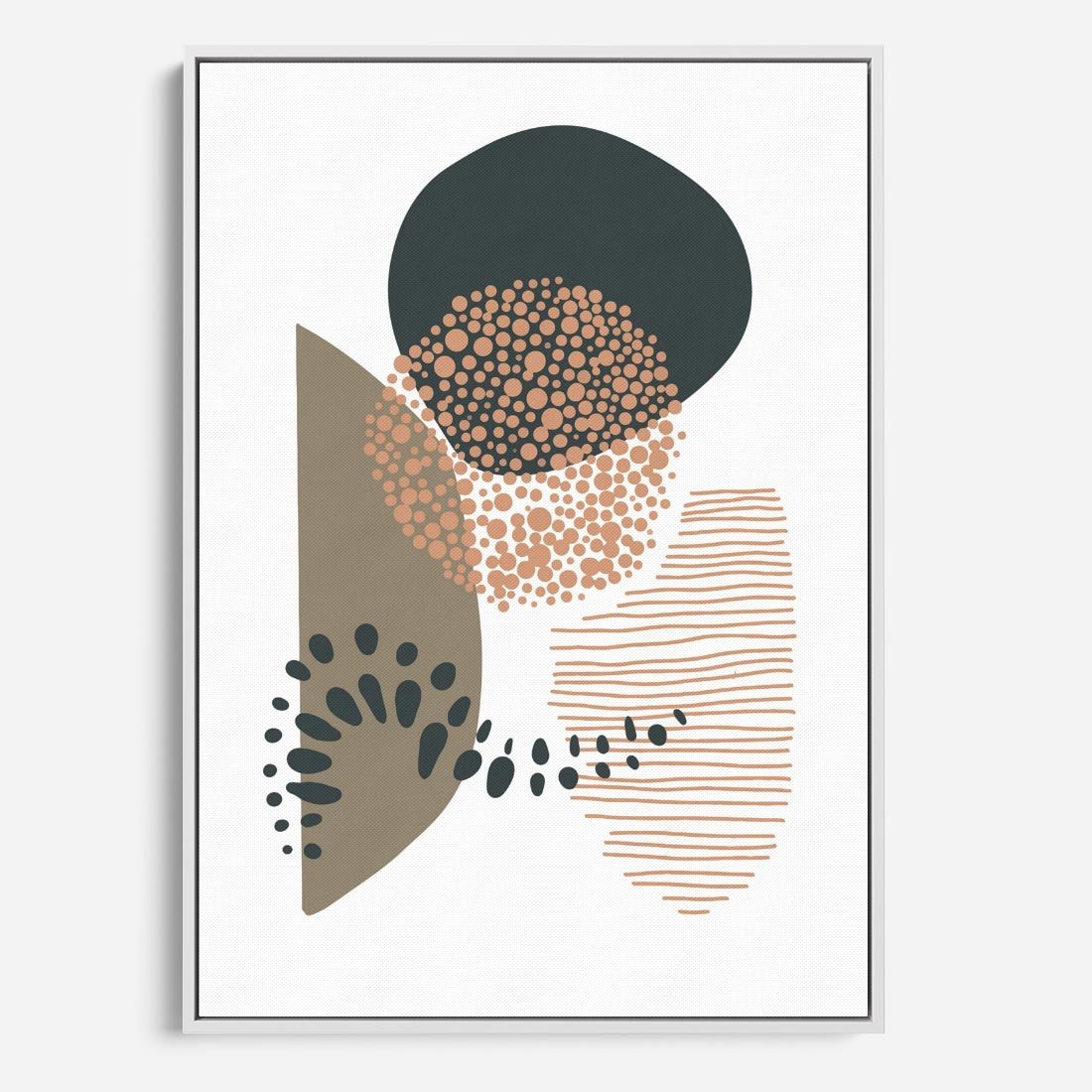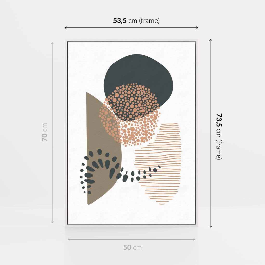 Ta abstrakcyjna kompozycja składa się z delikatnych kropek, kresek i kółek, w stonowanych odcieniach brązu i beżu. Przenosi spokój i harmonię, emanując minimalistycznym pięknem do każdego wnętrza.