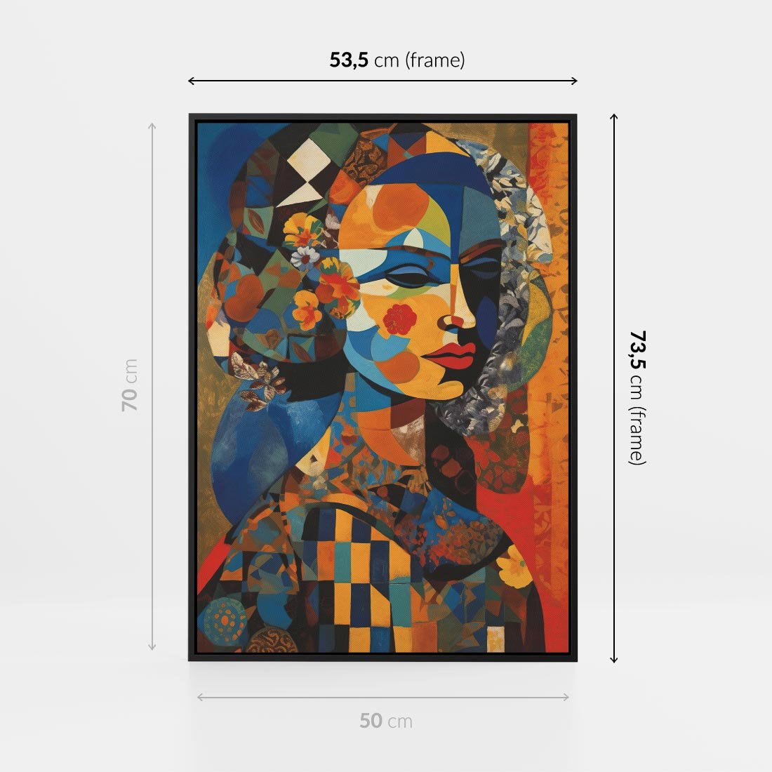 Ten abstrakcyjny obraz przedstawia portret kobiety w stylu przypominającym dzieła Picassa. Wyraziste, kolorowe plamy tworzą unikalną interpretację, oddającą charakter i piękno modelki w niekonwencjonalny sposób.