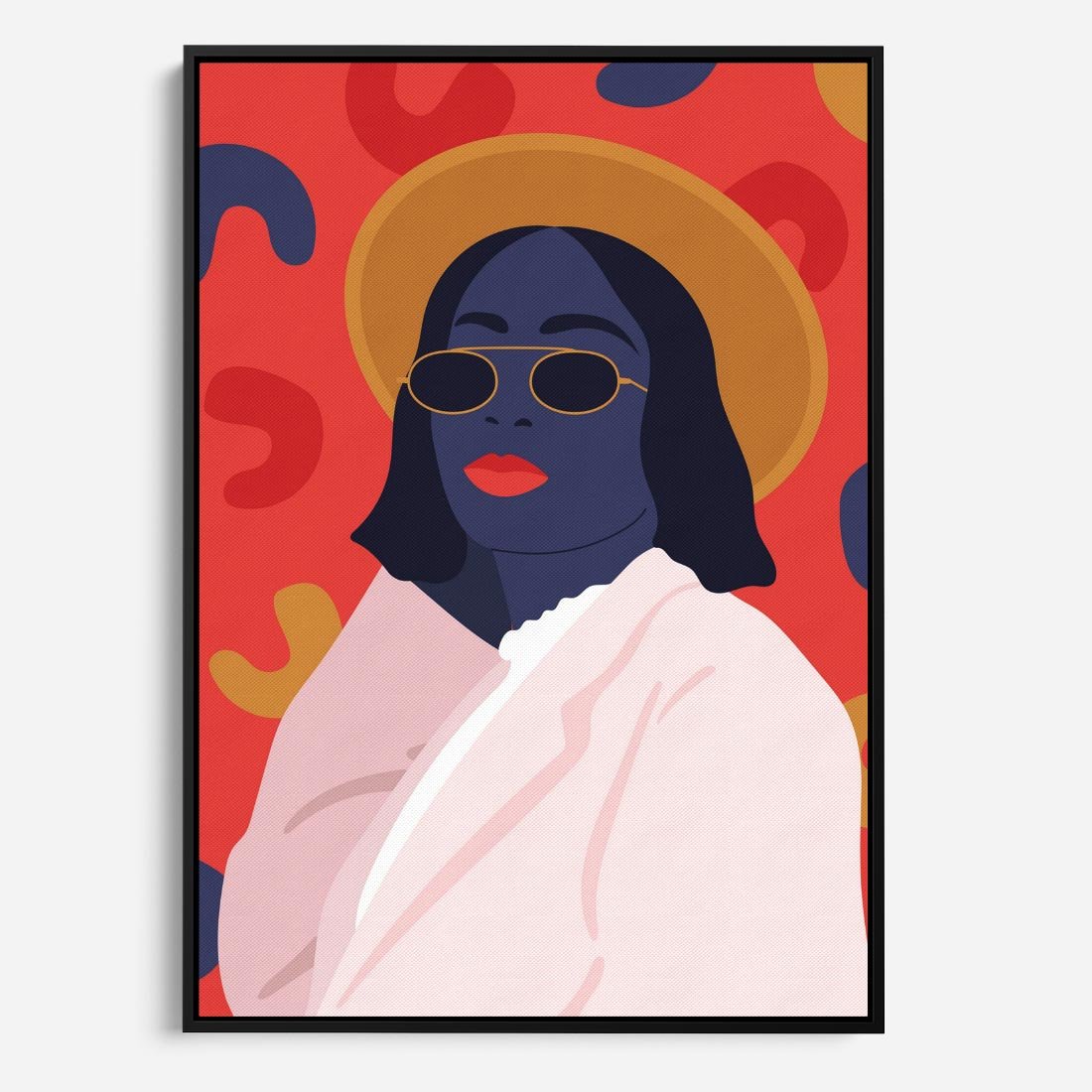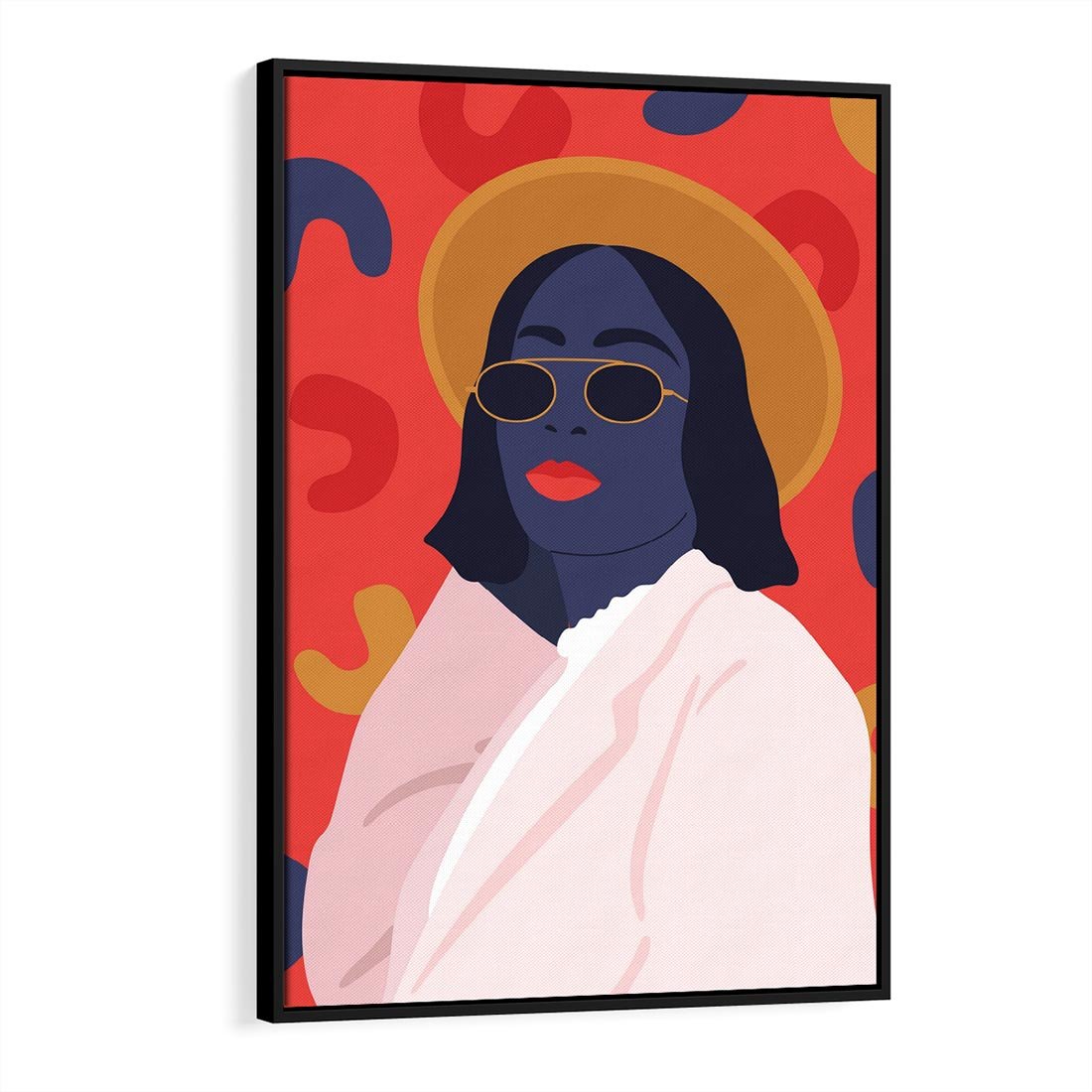 Nowoczesny plakat w stylu retro przedstawia kobietę w okularach słonecznych. Żywe kolory podkreślają jej styl i wyjątkowość, tworząc dynamiczną kompozycję pełną energii i osobowości.
