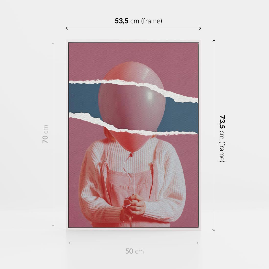 Ten abstrakcyjny kolaż z elementami stylu retro prezentuje dziewczynkę, której głowa zasłonięta jest różowym balonem. Przenosi nas w magiczny świat wyobraźni, gdzie rozdarta kartka nadaje niezwykłego charakteru i zahacza o tematykę snów i pragnień.