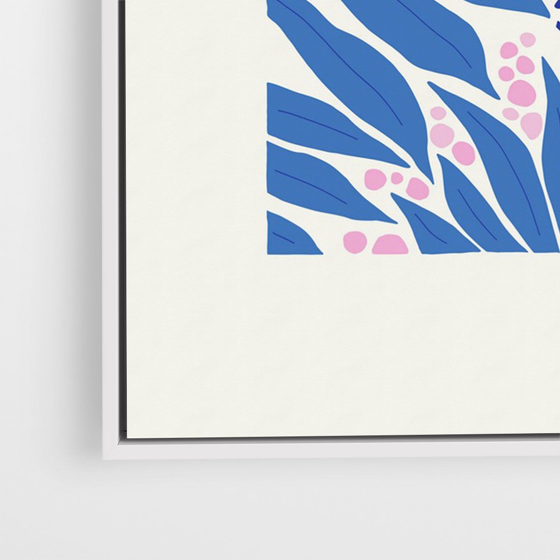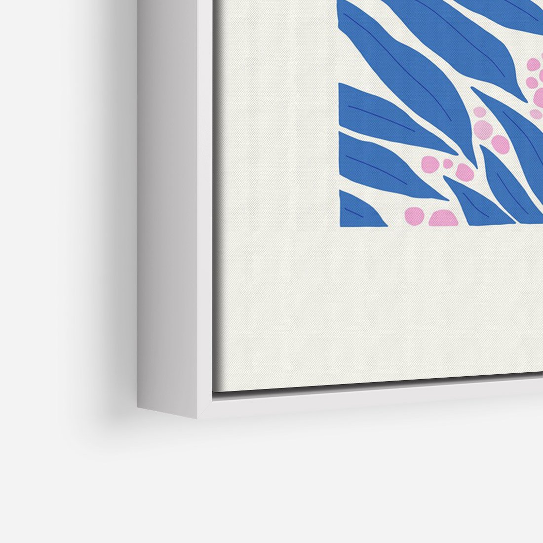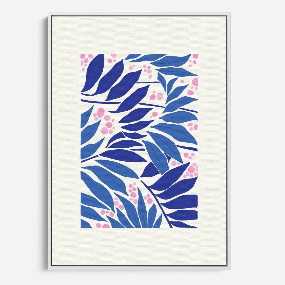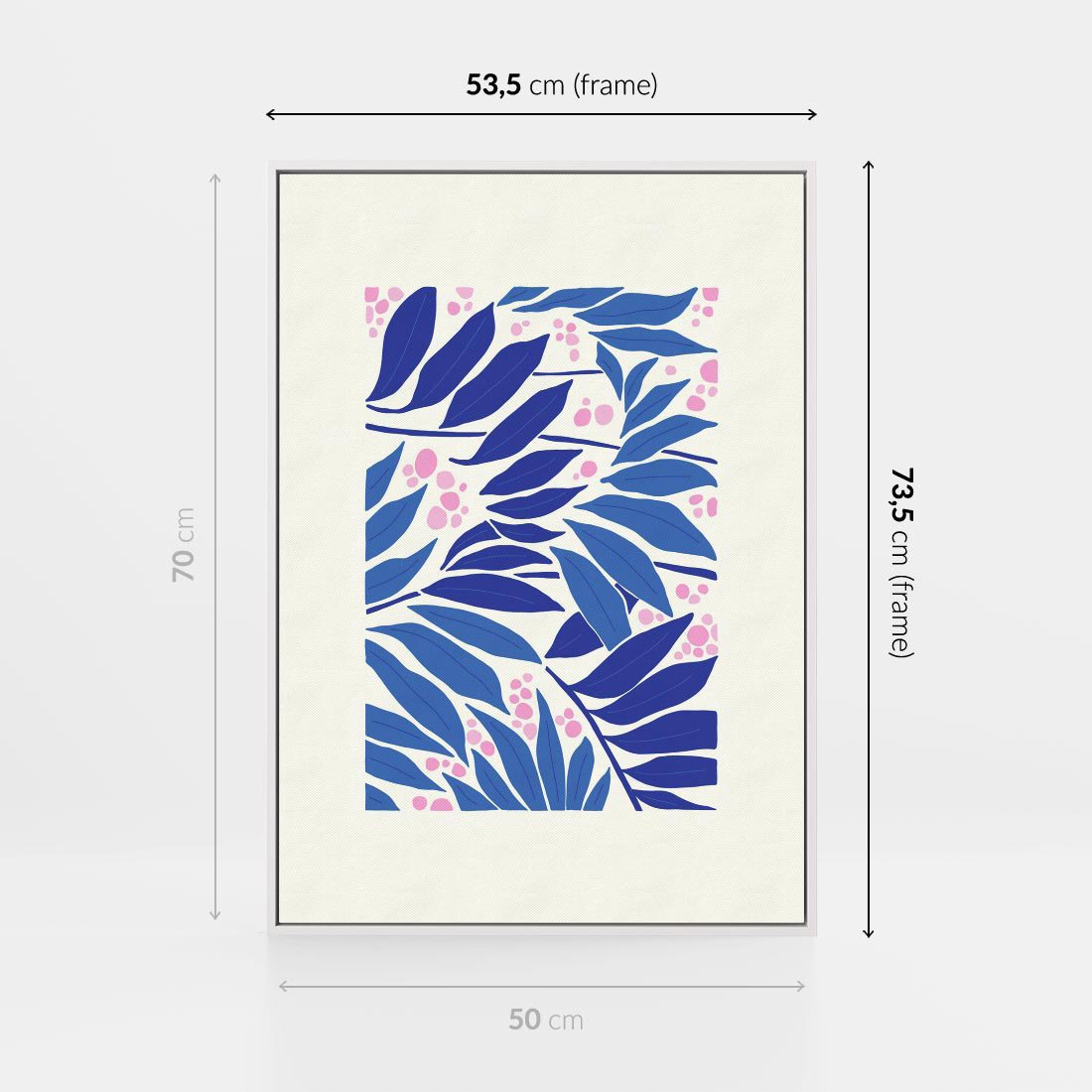 Ten nowoczesny plakat przedstawia abstrakcyjną liściastą kompozycję, w której dominują odcienie niebieskiego i błękitu. Sztuka ta tworzy spokojną i pełną harmonii atmosferę, zachęcając do kontemplacji natury i form w unikalny sposób.