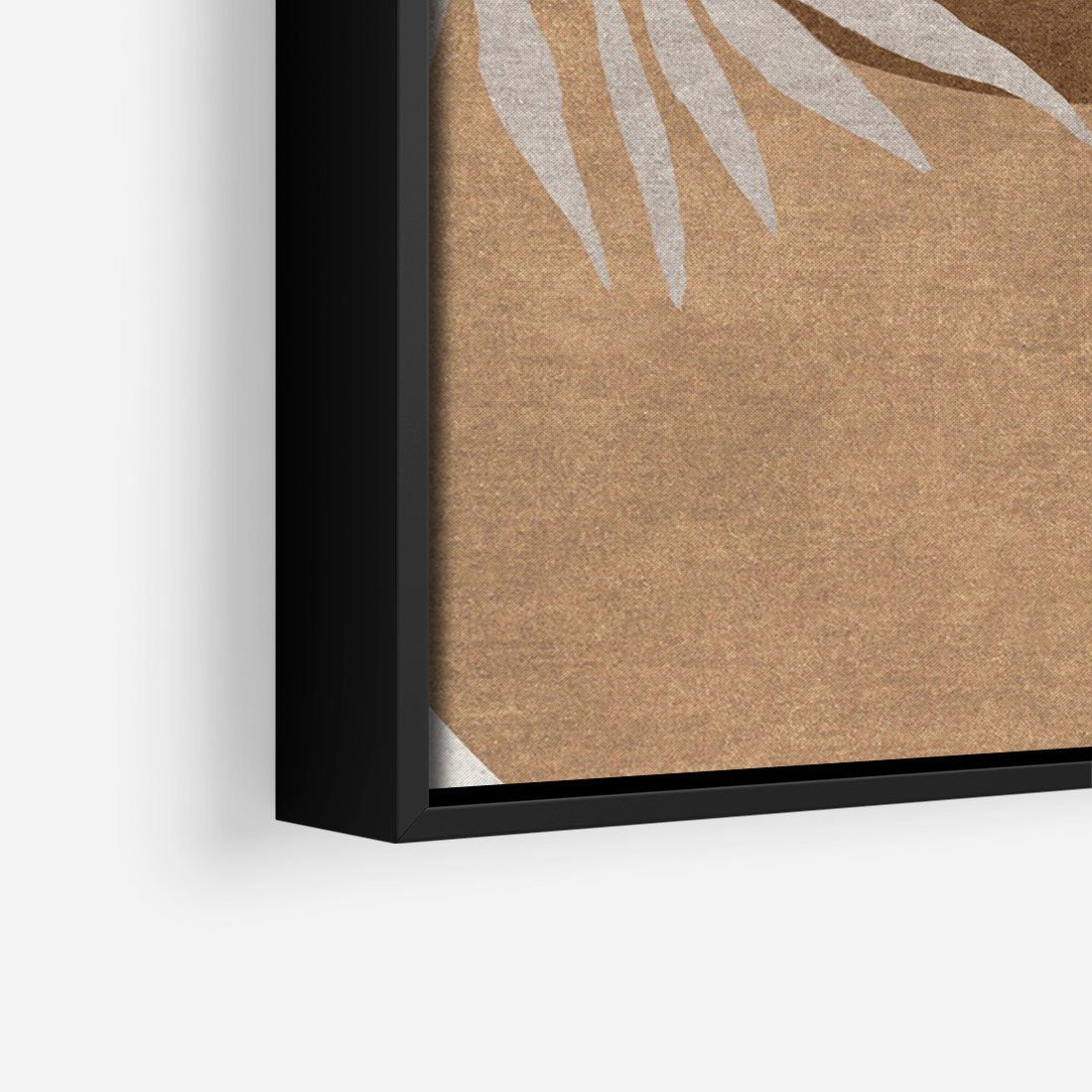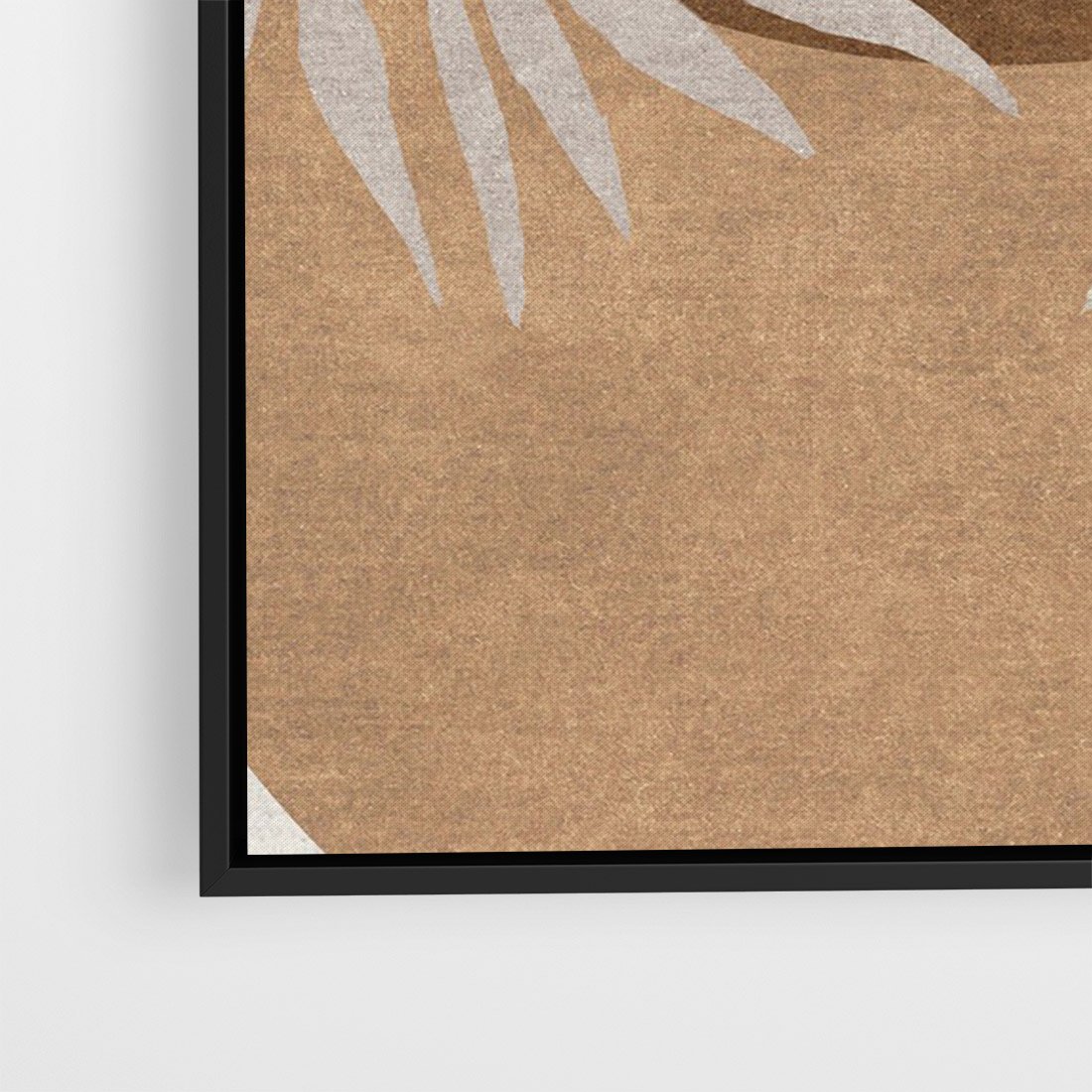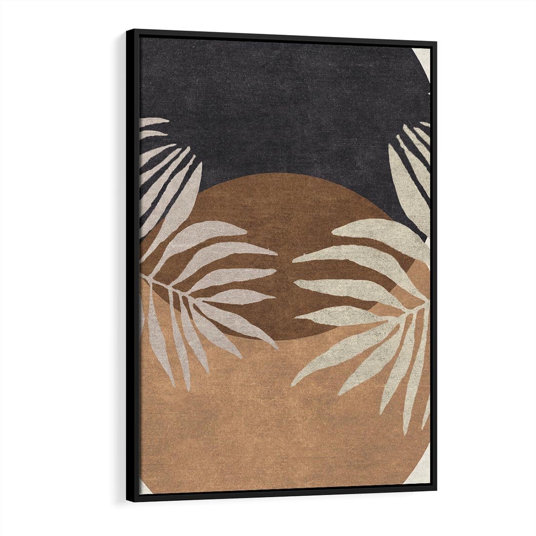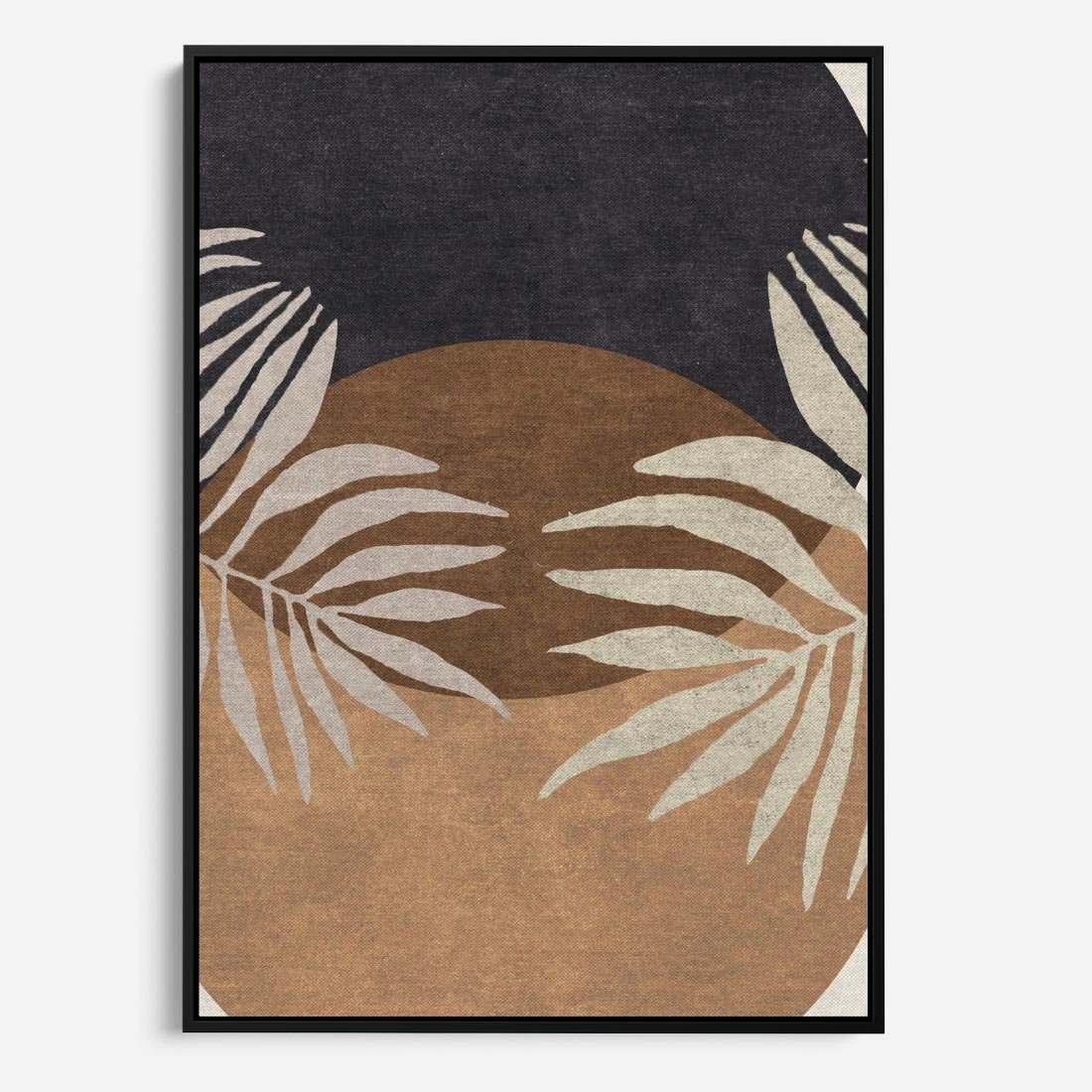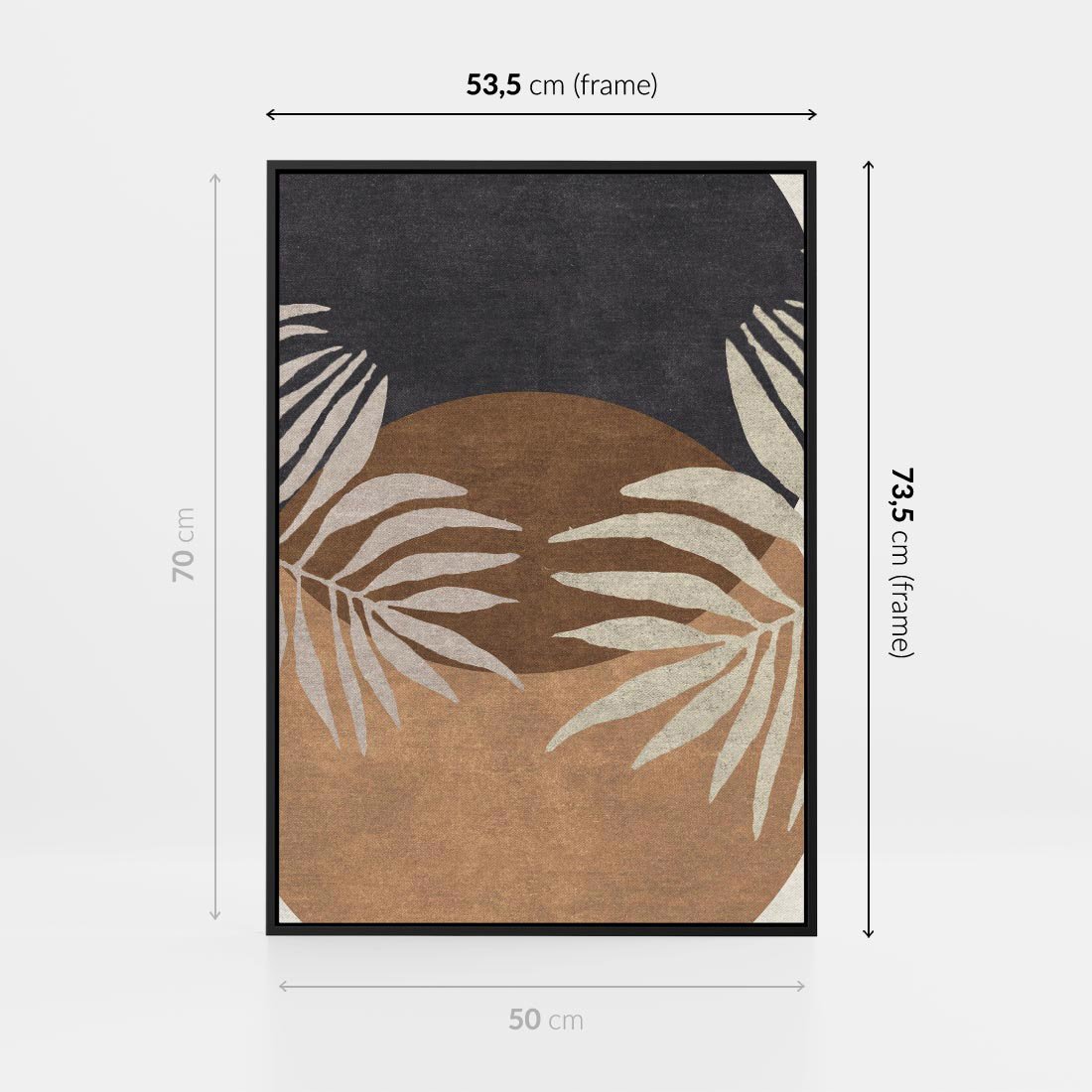 Odkryj wyjątkowy obraz w stylu boho, gdzie symetria i dwa duże koła po środku przyciągają uwagę. Brąz i czerń tworzą elegancką paletę barw. Po bokach umieszczone są delikatne liście palmy, dodające tropikalnego uroku. To dzieło sztuki stworzone dla miłośników stylu boho, którzy pragną wnieść artystyczną duszę do swoich wnętrz.