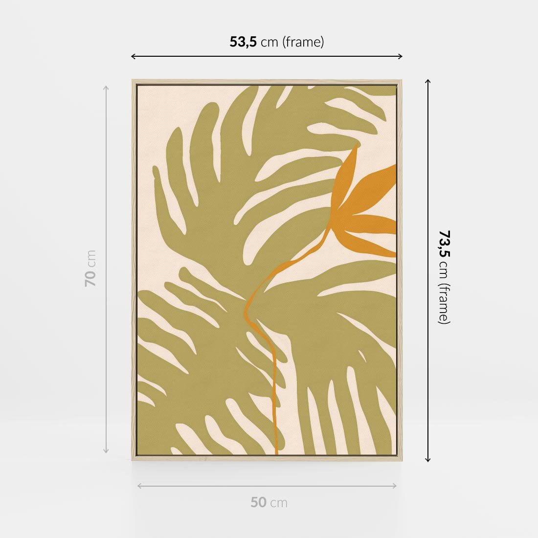 Ten minimalistyczny obraz, nawiązujący do modern art, przedstawia nieregularne kształty w beżowych odcieniach, które przypominają palmy. To artystyczne dzieło wprowadza do Twojej przestrzeni spokój i subtelną egzotyczną atmosferę, jednocześnie zachowując nowoczesny charakter.