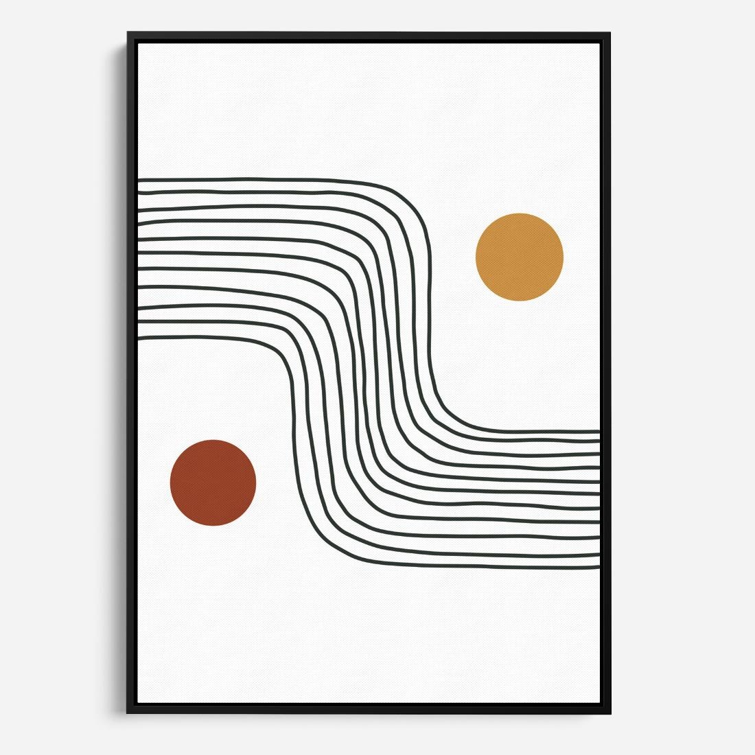 Ta minimalistyczna sztuka mid century wyróżnia się nieregularnymi liniami i geometrycznymi kołami, tworząc unikalną kompozycję. Wprowadź subtelny urok do swojego wnętrza, wyrażając równowagę i prostotę z nutą artystycznego ducha.