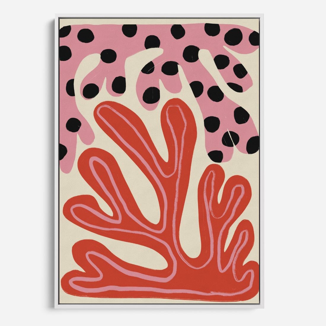 Ten abstrakcyjny obraz w formie plakatu fascynuje dziwnymi kształtami, które tworzą harmonię w odcieniach różowego i czerwonego. Jego wyjątkowość polega na zdolności zachęcania do refleksji, pobudzając wyobraźnię widza poprzez niekonwencjonalne kompozycje i intensywne barwy.