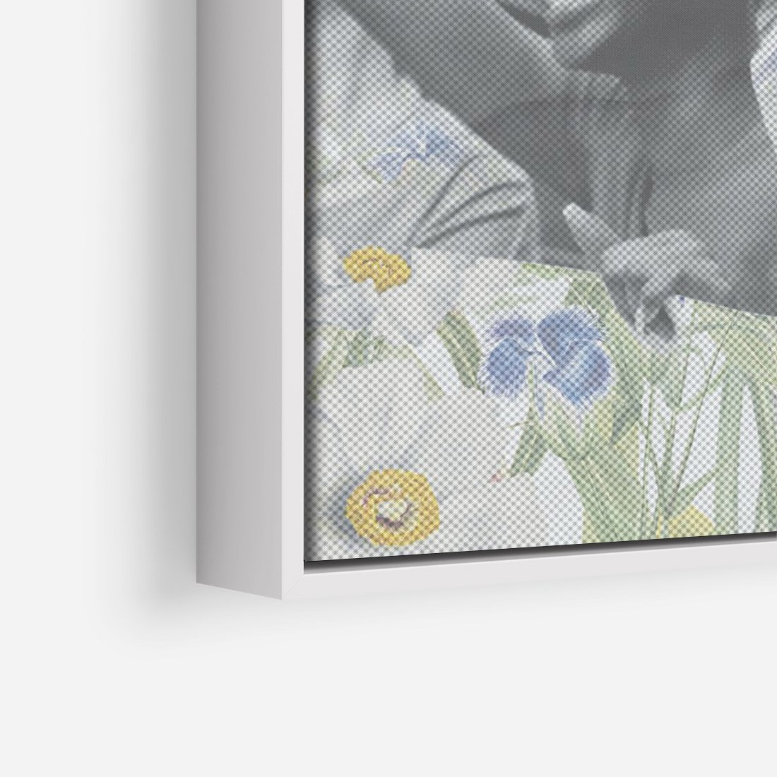 Zapraszamy do odkrycia tego wyjątkowego kolażu, który ukazuje czarno-białe zdjęcie wesołych młodych ludzi, otoczonych tłem z kwiatów retro. Doskonały akcent dla tych, którzy pragną wprowadzić do swoich wnętrz unikalny i radosny wyraz.