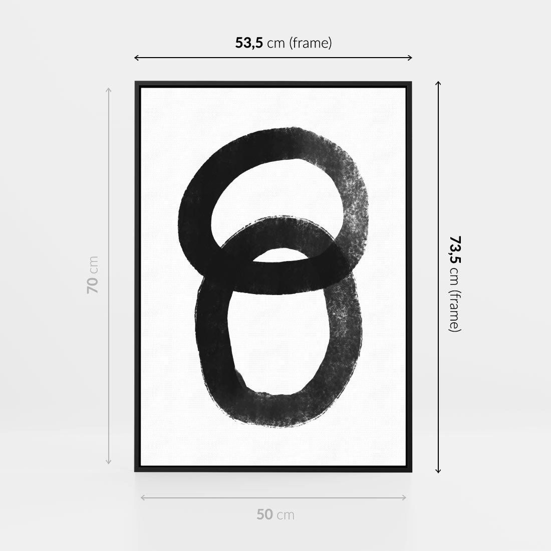 To abstrakcyjne dzieło sztuki w stylu minimalizmu i modern artu prezentuje czarne koła zaplecione w dynamiczną kompozycję. Jego proste, ale wyraziste formy oddają nowoczesny charakter, doskonale pasując do różnych przestrzeni i wzbogacając wnętrza o oryginalność.