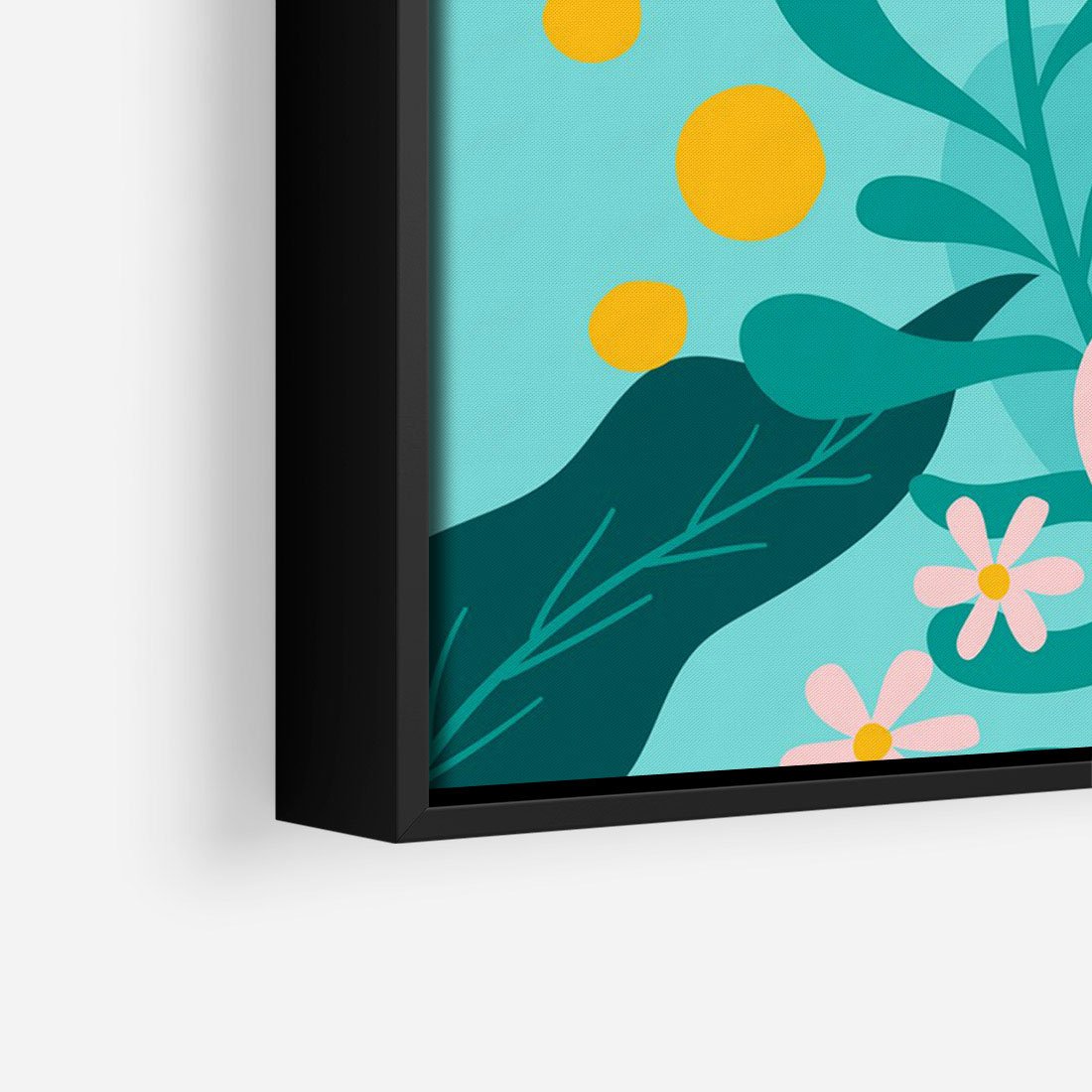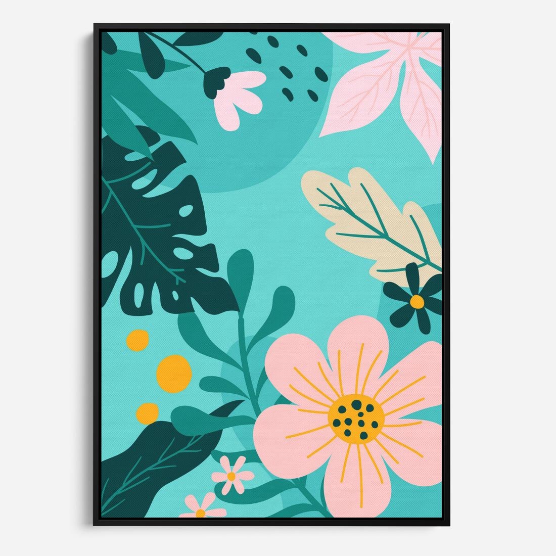 Pastelowa kompozycja wzbogacona kwiatami i tropikalnymi liśćmi w odcieniach turkusu i różu. To artystyczne połączenie natury i delikatności, tworzące harmonijną atmosferę.