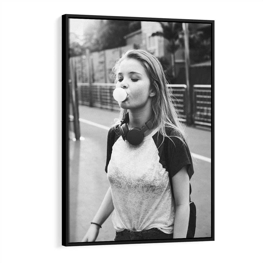 To nowoczesne czarno-białe zdjęcie przedstawia młodą dziewczynę w trakcie zabawy, gdzie robi balony z gumy. Zdjęcie ukazuje radość i beztroską chwilę młodości. Czarno-biała paleta kolorów dodaje zdjęciu elegancji i klasycznego wyglądu, a jednocześnie uchwyciła chwilę współczesności. To idealna fotografia do nowoczesnych wnętrz, które doceniają wyrażenie młodzieńczej radości i spontaniczności.