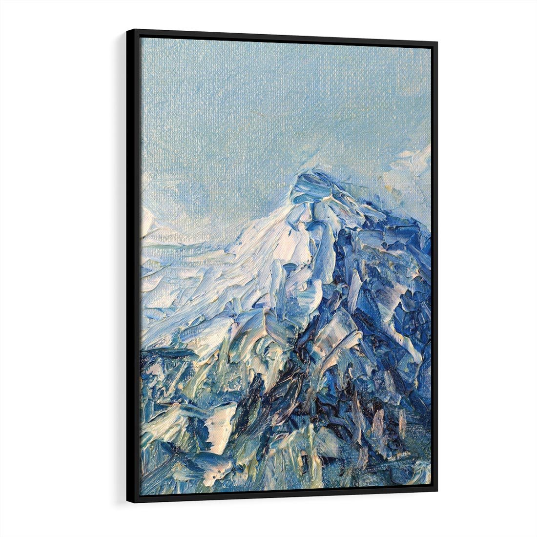 Ten olejny obraz ukazuje górski pejzaż z ośnieżoną górą, która wznosi się ponad malowniczą krainą. Błękity dominujące w kompozycji podkreślają spokój i majestat natury. Majestat Błękitnych Szczytów przenosi nas w piękno alpejskiej krainy, gdzie błękitne odcienie nieba i śniegu tworzą niesamowitą atmosferę i przestrzeń.
