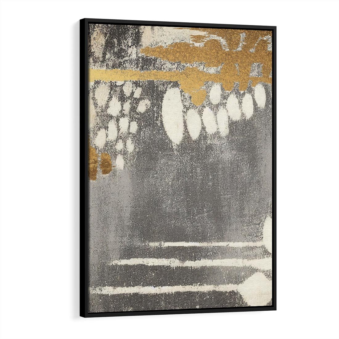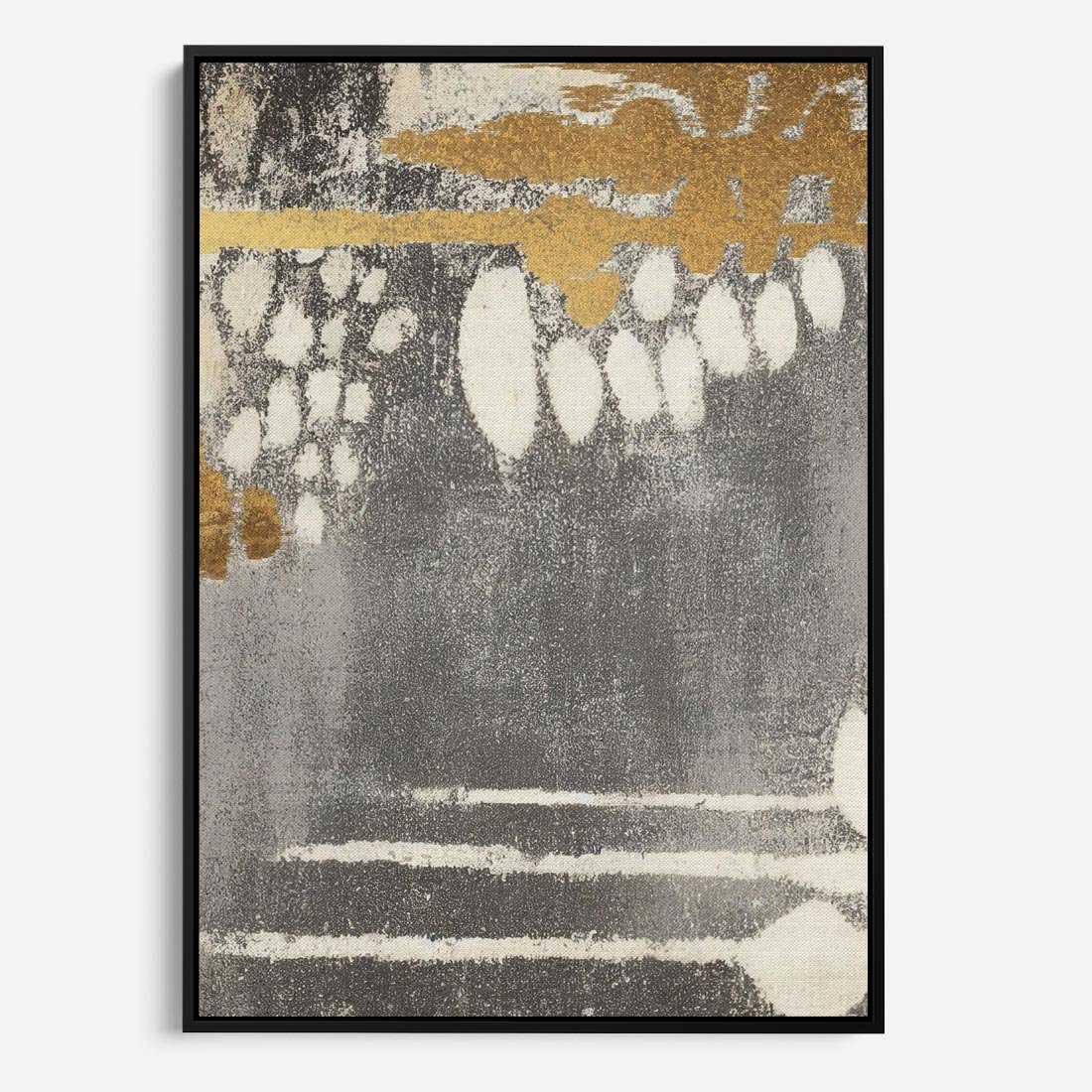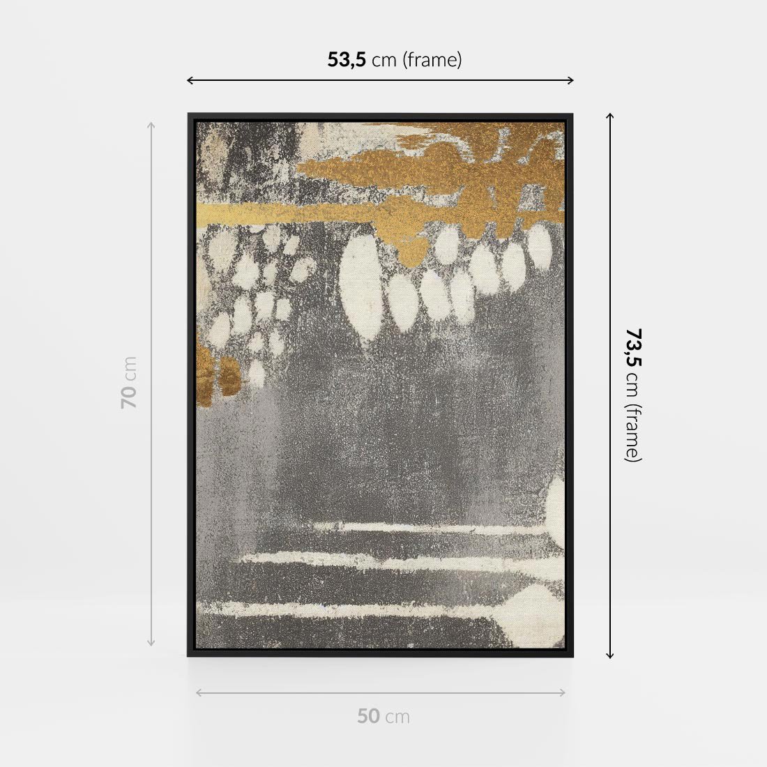 Odkryj fascynujący obraz w stylu vintage, gdzie abstrakcyjne plamy i linie łączą się na szarym teksturalnym tle. Złote przetarcia dodają mu klasy. Dla miłośników sztuki i estetyki loftowej, obraz ten wprowadzi wyjątkową atmosferę i artystyczny klimat do przestrzeni. Doskonały akcent dla wnętrz o charakterze industrialnym i nostalgicznej elegancji.