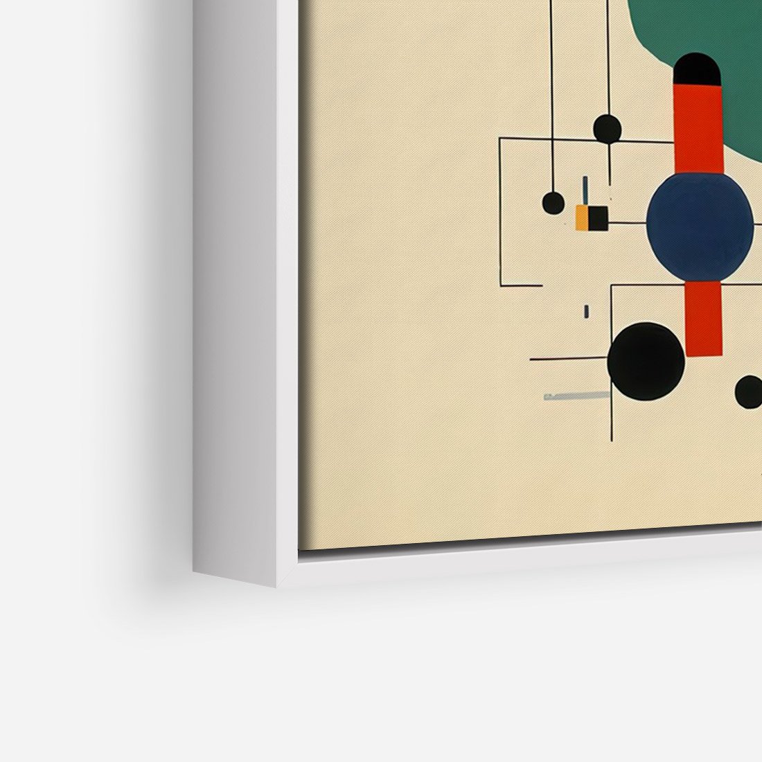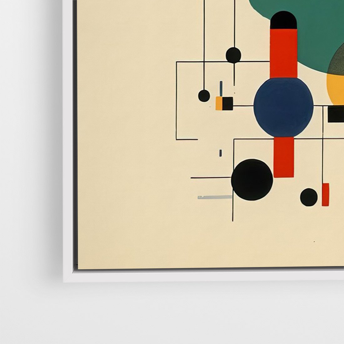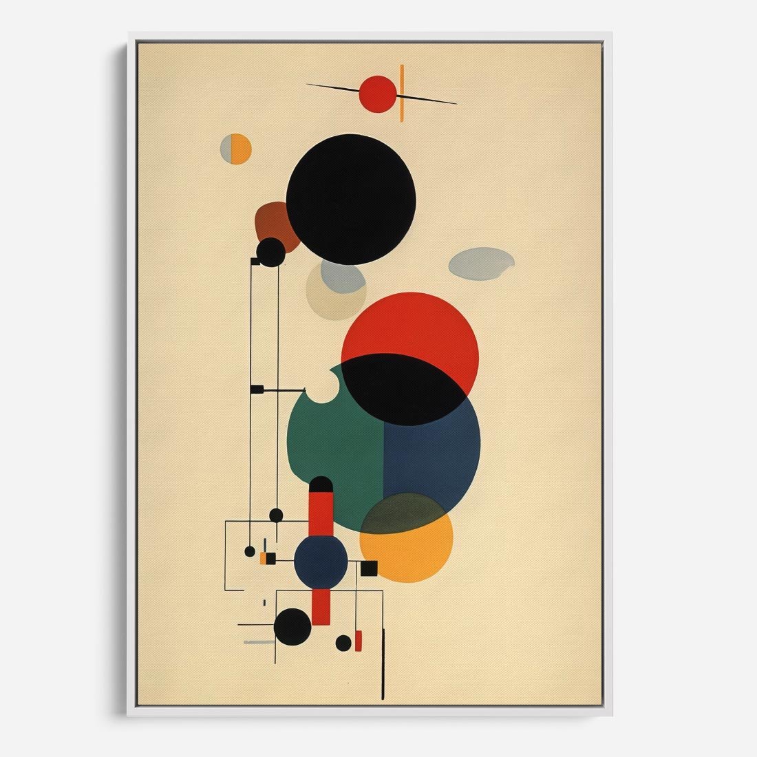 Ta abstrakcyjna geometryczna kompozycja inspirowana stylem Kandinsky'ego łączy w sobie elementy kół i linii, tworząc dynamiczną i ekspresyjną wizję. Ten wpływ dodaje głębi i emocji temu obrazowi.