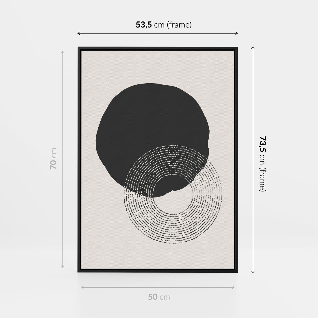 Ta wyjątkowa abstrakcyjna kompozycja to zmysłowa gra okręgów w stonowanych odcieniach czerni i beżu. Minimalistyczne formy tworzą dynamiczny układ, który jednocześnie emanuje spokojem i równowagą. Każdy okrąg jest precyzyjnie umieszczony, tworząc harmonijną symetrię. To dzieło sztuki zaprasza do kontemplacji nad kontrastami i proporcjami, a jednocześnie stanowi subtelne wcielenie minimalistycznego piękna i elegancji.