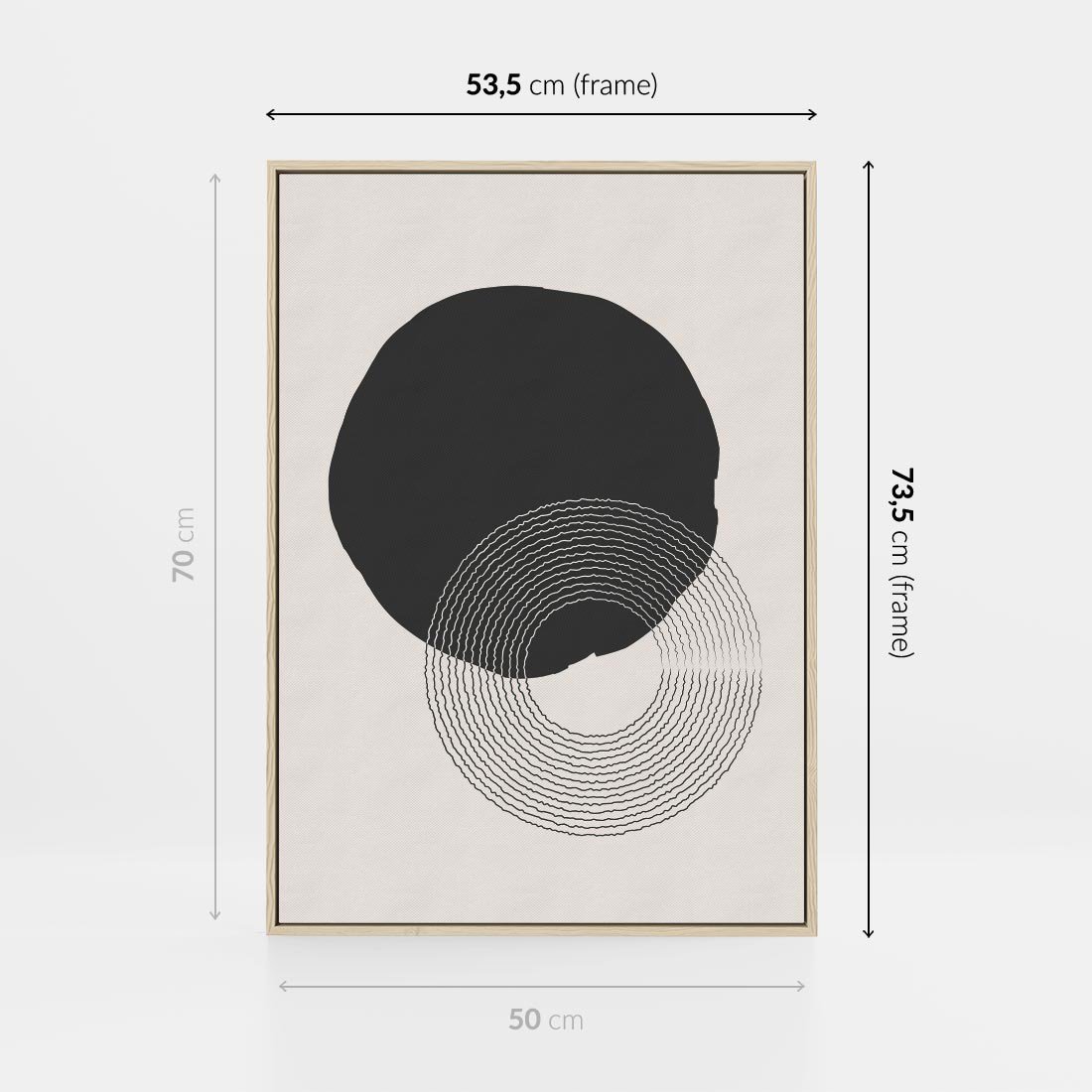 Ta wyjątkowa abstrakcyjna kompozycja to zmysłowa gra okręgów w stonowanych odcieniach czerni i beżu. Minimalistyczne formy tworzą dynamiczny układ, który jednocześnie emanuje spokojem i równowagą. Każdy okrąg jest precyzyjnie umieszczony, tworząc harmonijną symetrię. To dzieło sztuki zaprasza do kontemplacji nad kontrastami i proporcjami, a jednocześnie stanowi subtelne wcielenie minimalistycznego piękna i elegancji.